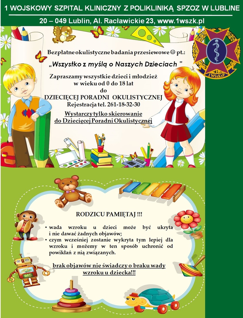 Dziecięca Przychodnia Okulistyczna 1 Wojskowego Szpitala Klinicznego z Polikliniką SPZOZ w Lublinie zaprasza dzieci i młodzież, które nie ukończyły 18 lat na bezpłatne okulistyczne badania przesiewowe.