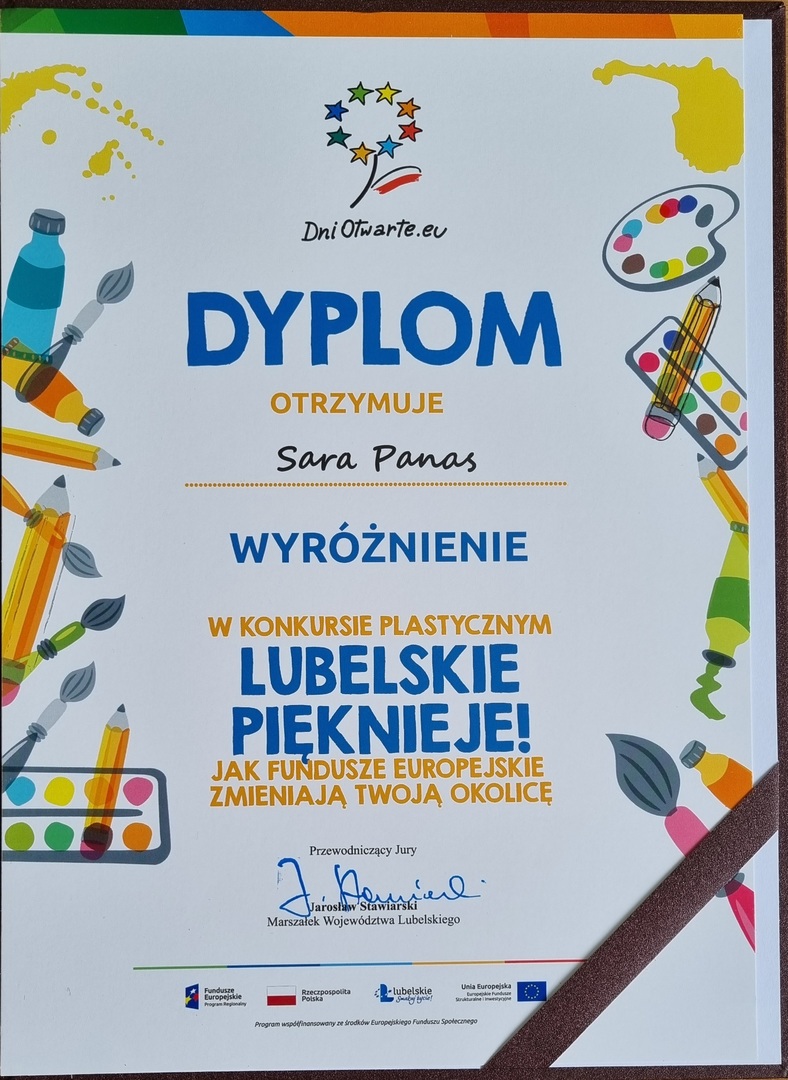 Miło nam powiadomić społeczność szkolną o sukcesie uczennicy Sary Panas z klasy V d. W wojewódzkim konkursie plastycznym, który organizowany był pod patronatem Marszałka Województwa Lubelskiego Jarosława Stawiarskiego. Prace Laureatów konkursu zostały uznane przez komisję konkursową za najbardziej kreatywne przedstawienie pozytywnych zmian, jakie nastąpiły w ich otoczeniu dzięki środkom z Unii Europejskiej.
