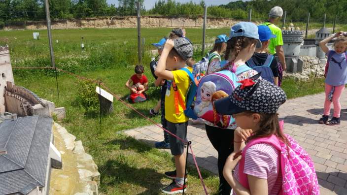 Park Żywiołów to część Archipelagu Roztocze w Budach, który dzięki nowoczesnej technologii pozwala na świetną zabawę. Tworzyliśmy własne melodie, graliśmy w różne gry, rozpoznawaliśmy zapachy, pokonywaliśmy laserowy tor przeszkód. Z piasku usypywaliśmy góry, które zmieniały kolory. Przez lunety obserwowaliśmy i rozpoznawali zwierzęta. Dużo frajdy sprawiła zjeżdżalnia. W parku miniatur zamieniliśmy się w olbrzymów, którzy słuchali ciekawej opowieści pana przewodnika o zamkach, pałacach i budowlach obronnych. Na placu zabaw najbardziej podobała się nam tyrolka, na której zjeżdżali najodważniejsi. Natomiast w labiryncie nikomu nie udało się zagubić, każdy potrafił odnaleźć wyjście. Było dużo różnorodnej zabawy i pozytywnych emocji, o których moglibyśmy jeszcze długo opowiadać. Zachęcamy Was do odwiedzenia tego miejsca, mieszczącego się niedaleko naszego miasta.