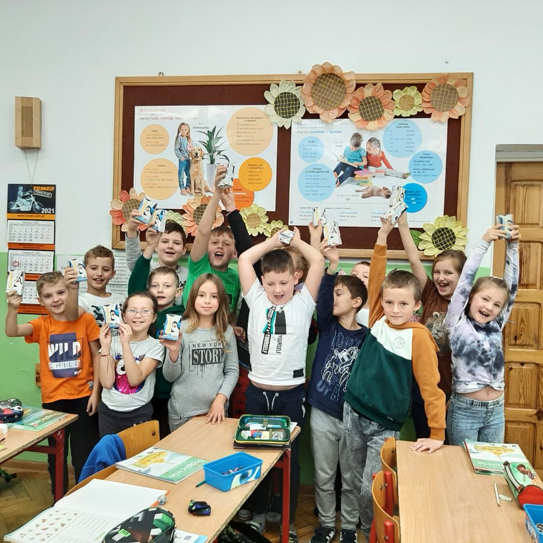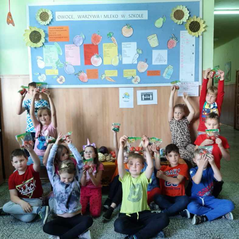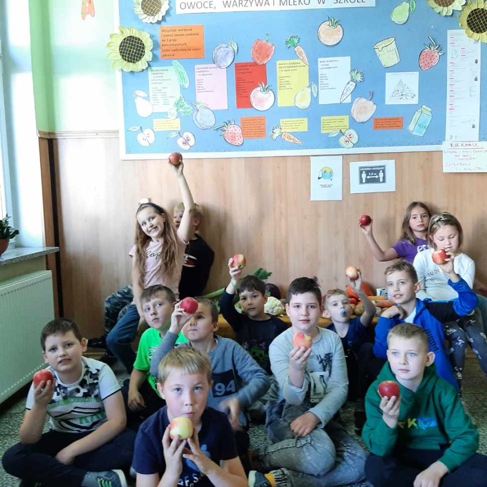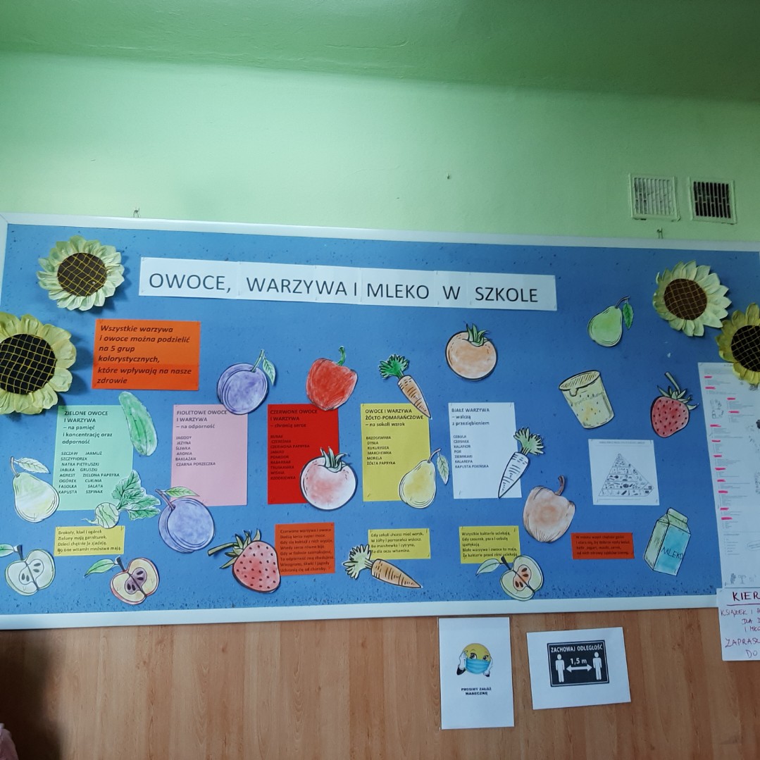 Przez 12 tygodni dzieci z klas I-V naszej szkoły otrzymywać będą 3 razy w tygodniu owoce, warzywa i produkty mleczne. Będziemy uczyć się zasad zdrowego odżywiania, w szczególności poznawać korzyści diety bogatej w owoce, warzywa i produkty mleczne, a także zdobywać wiedzę na temat ich pochodzenia, uprawy i produkcji oraz m.in. jak postępować, aby nie marnować żywności. Obejrzeliśmy już część filmów z serii edukacyjnej „Ekipa Chrumasa gotuje” i wysłuchaliśmy pierwsze zaproponowane słuchowiska. Przygotowaliśmy wystawkę owoców i warzyw na korytarzu szkolnym oraz gazetkę o kolorach i właściwościach wspomnianych produktów.