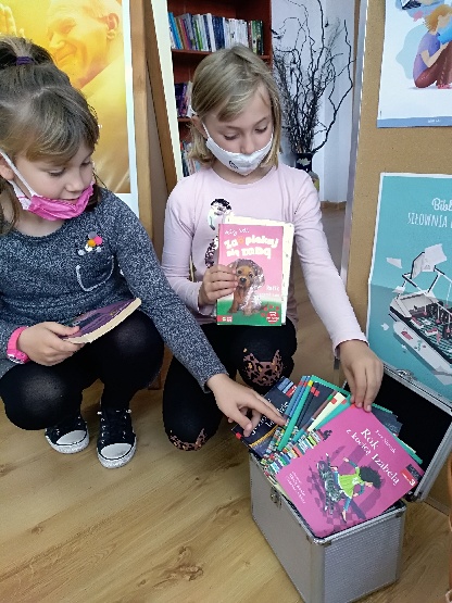 W kl. I – III wychowawcy wybierali ze swoimi uczniami z książkowego kuferka lekturę z serii „Czytam sobie” oraz „Poczytaj mi mamo” – do głośnego czytania w klasie i w bibliotece.