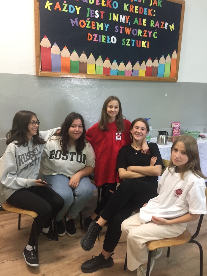 W tym roku szkolnym do grupy wolontariuszy Szkolnego Koła Caritas dołączyli nowi członkowie. Oto relacja z naszego udanego październikowego spotkania. Po wspólnej modlitwie różańcowej był podwieczorek - słodkie drożdżówki i kompot przygotowany przez Panią Samek. Potem zabawy integracyjne z tańcami. Wspólnie zaplanowaliśmy co będziemy robić, w tym roku szkolnym. Wybraliśmy również nowy zarząd. Przewodniczącą została Magdalena, zastępcą Luiza, skarbnikami Hania i Michał, a sekretarzem Ola.
