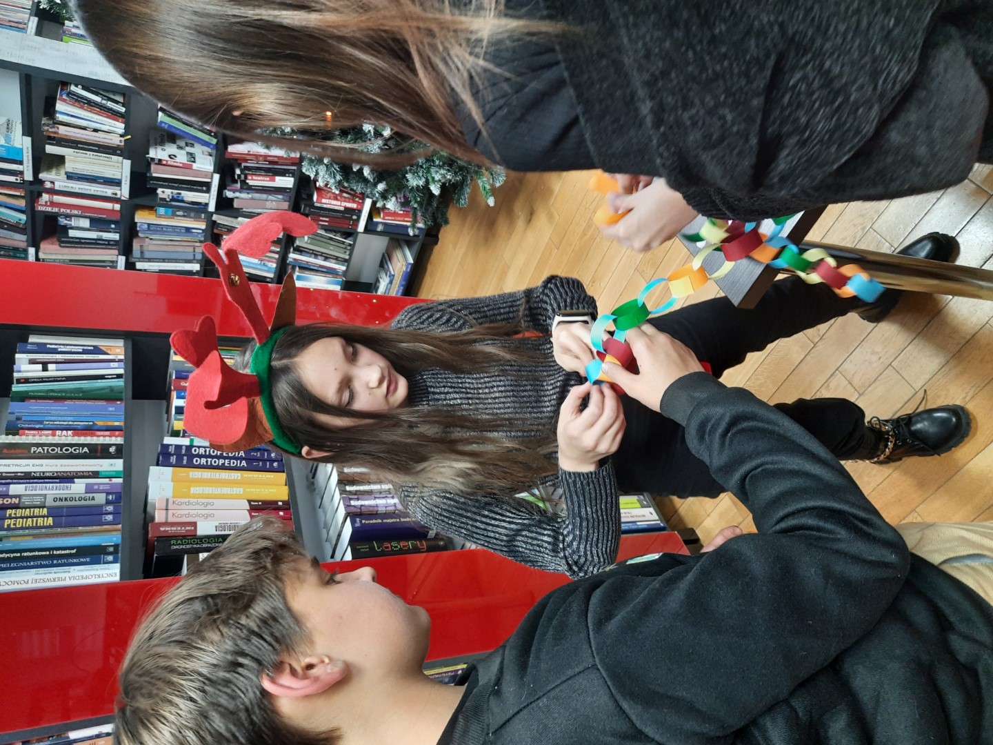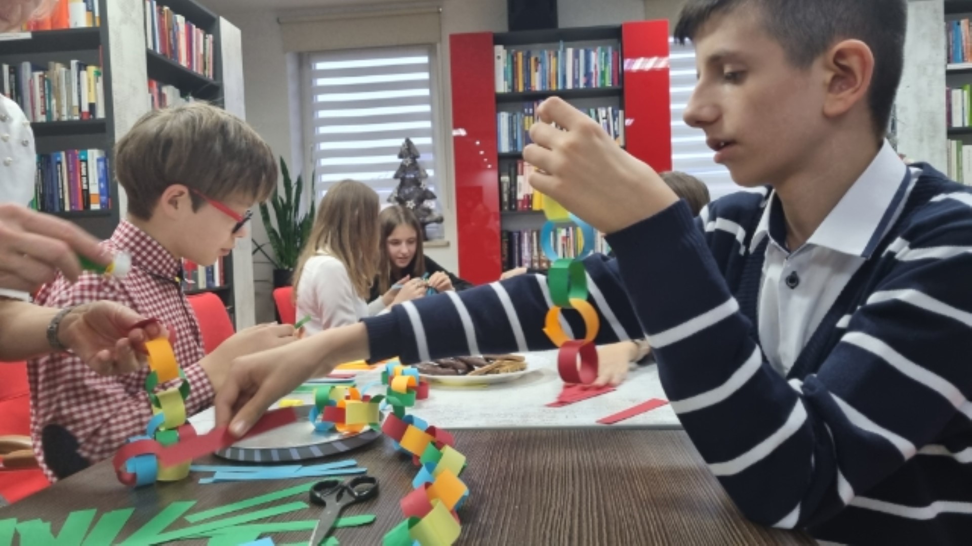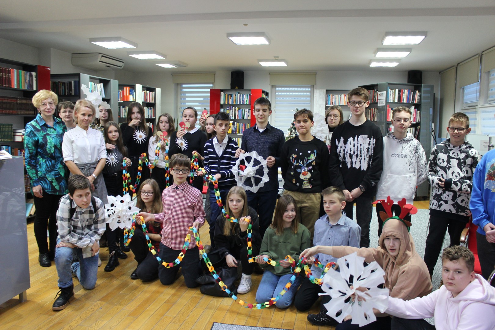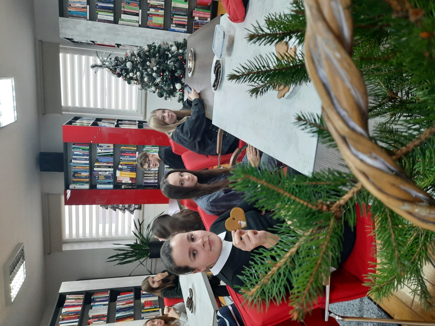 Spotkanie rozpoczęliśmy od dyskusji na temat zwyczajów i tradycji świątecznych. Przytoczyliśmy fragmenty znanych utworów literackich, w których pojawia się motyw Świąt Bożego Narodzenia, jak np.: "Opowieść wigilijna ", "Harry Potter I kamień filozoficzny", "W pustyni i w puszczy " i in. Nie po raz pierwszy przybyliśmy do biblioteki we wzmocnionym składzie. W świątecznych warsztatach, oprócz klubowiczów, aktywny udział wzięli wszyscy uczniowie klasy VII C, którzy odegrali dla nas scenkę świąteczną oraz pomagali w wykonywaniu tradycyjnych ozdób świątecznych, między innymi 12-metrowego choinkowego łańcucha! Z technikami wykonywania tych tradycyjnych świątecznych dekoracji zapoznała nas pani Anna Woś - nauczyciel plastyki w SP2, której dziękujemy za pomoc, cierpliwość i profesjonalizm. Nie zabrakło oczywiście świątecznych pierniczków typu home-made (własnej roboty) oraz tradycyjnych polskich kolęd.