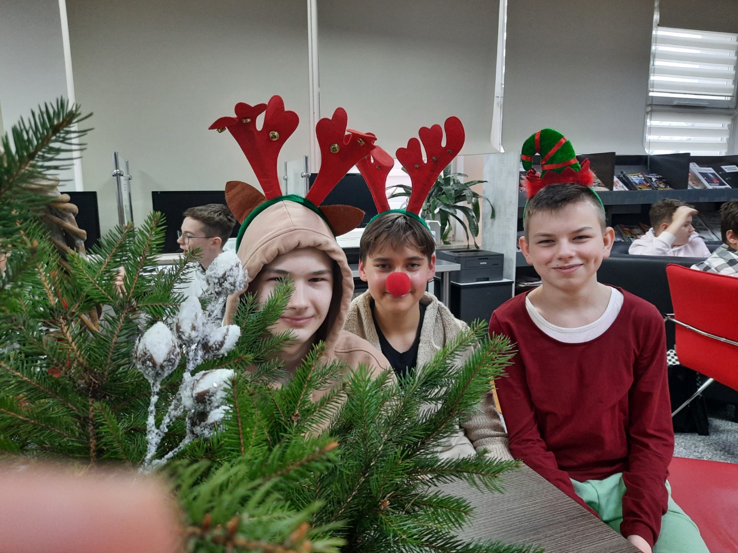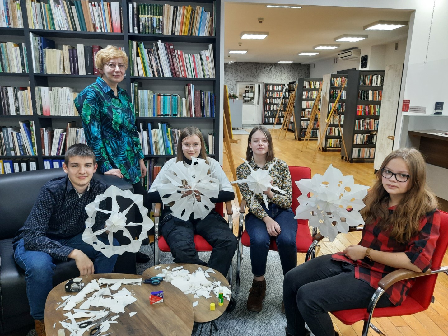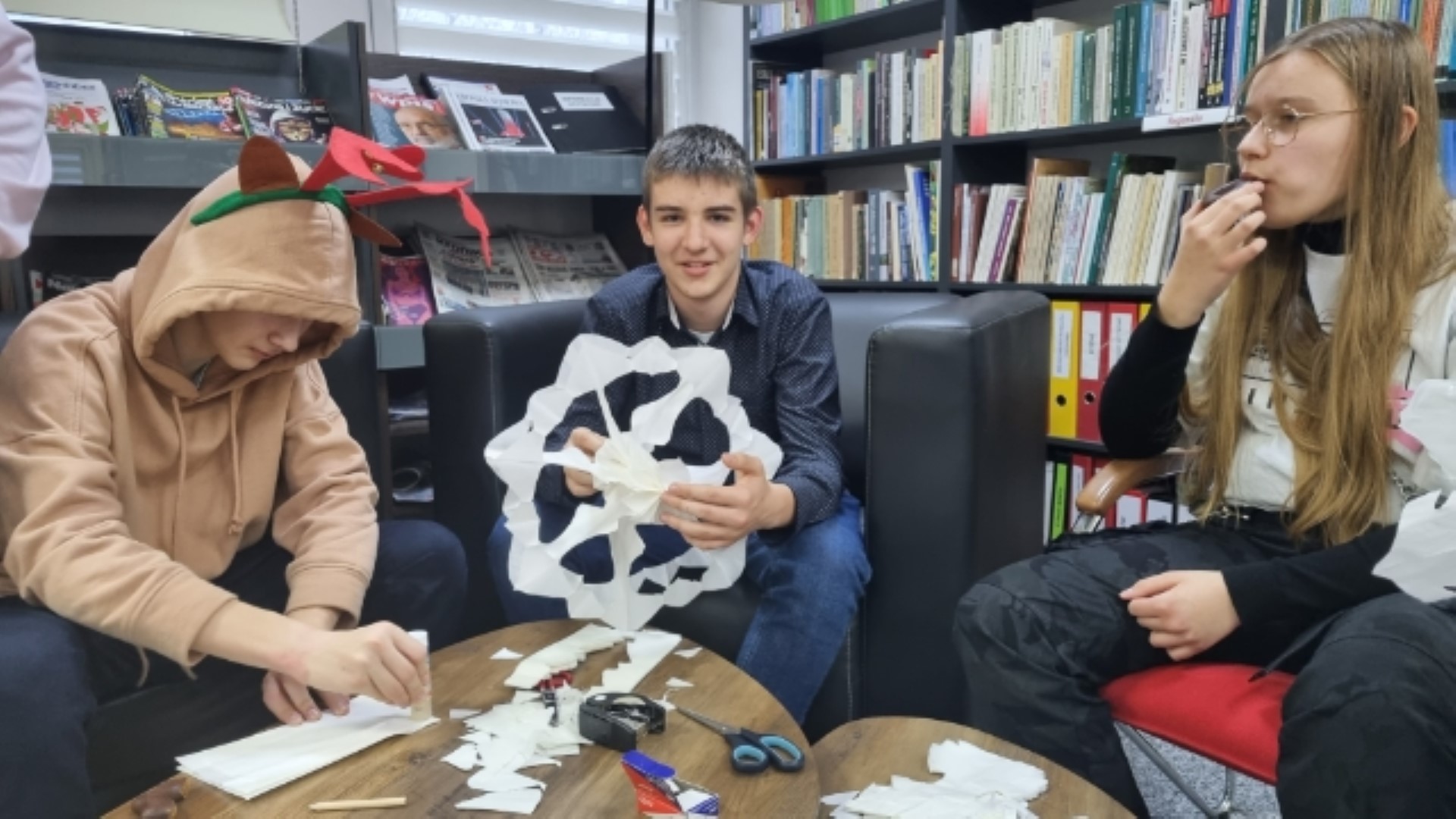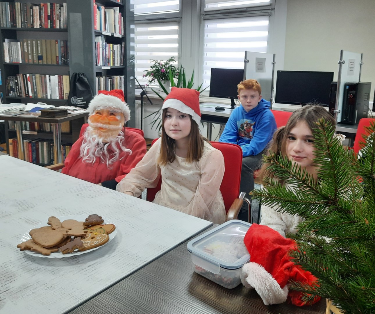 Spotkanie rozpoczęliśmy od dyskusji na temat zwyczajów i tradycji świątecznych. Przytoczyliśmy fragmenty znanych utworów literackich, w których pojawia się motyw Świąt Bożego Narodzenia, jak np.: "Opowieść wigilijna ", "Harry Potter I kamień filozoficzny", "W pustyni i w puszczy " i in. Nie po raz pierwszy przybyliśmy do biblioteki we wzmocnionym składzie. W świątecznych warsztatach, oprócz klubowiczów, aktywny udział wzięli wszyscy uczniowie klasy VII C, którzy odegrali dla nas scenkę świąteczną oraz pomagali w wykonywaniu tradycyjnych ozdób świątecznych, między innymi 12-metrowego choinkowego łańcucha! Z technikami wykonywania tych tradycyjnych świątecznych dekoracji zapoznała nas pani Anna Woś - nauczyciel plastyki w SP2, której dziękujemy za pomoc, cierpliwość i profesjonalizm. Nie zabrakło oczywiście świątecznych pierniczków typu home-made (własnej roboty) oraz tradycyjnych polskich kolęd.