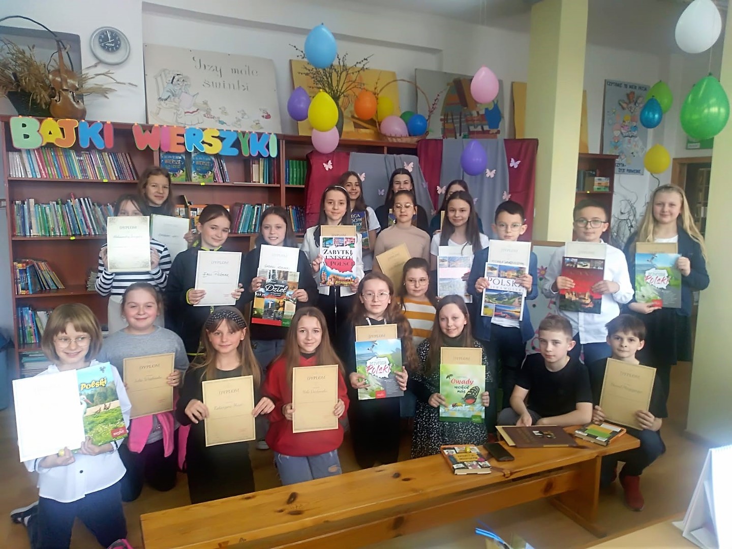 W dniu 29 marca 2022 r. odbył się konkurs recytatorski dla klas IV – VIII „Biesiada literacka” zorganizowany przez bibliotekę szkolną. Celem konkursu było zapoznanie uczniów z wartością literatury, rozbudzenie poczucia piękna i umiejętności jego przeżywania, rozbudzenie wyobraźni i wrażliwości, rozwijanie umiejętności posługiwania się językiem ojczystym oraz rozwijanie zdolności aktorskich. W konkursie wzięło udział 22 uczniów klas IV – VIII. Komisja w składzie: przewodnicząca dyrektor Marta Prus, Monika Czernek oraz Barbara Wiśniewska przy ocenie recytacji brała pod uwagę - dobór repertuaru, kulturę słowa, artystyczną interpretację utworu oraz ogólny wyraz artystyczny. Jury po wysłuchaniu wszystkich recytacji przyznała 13 nagród.