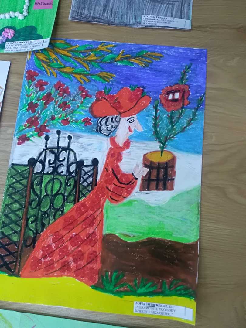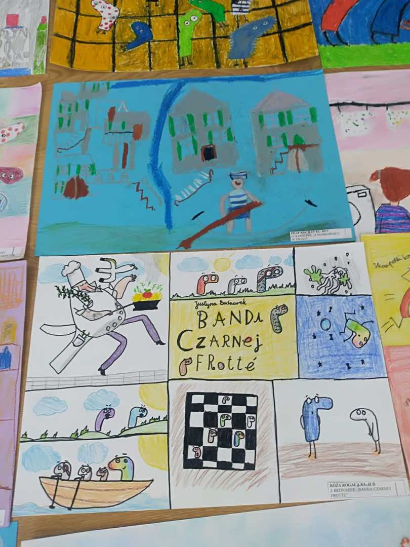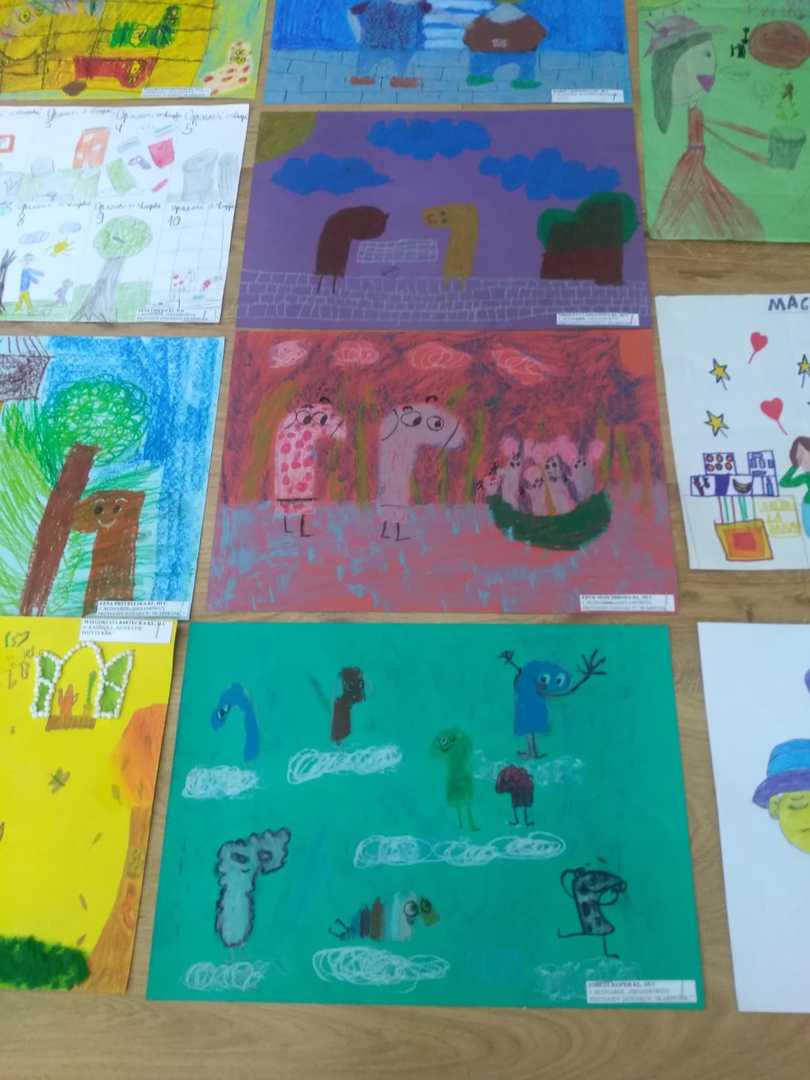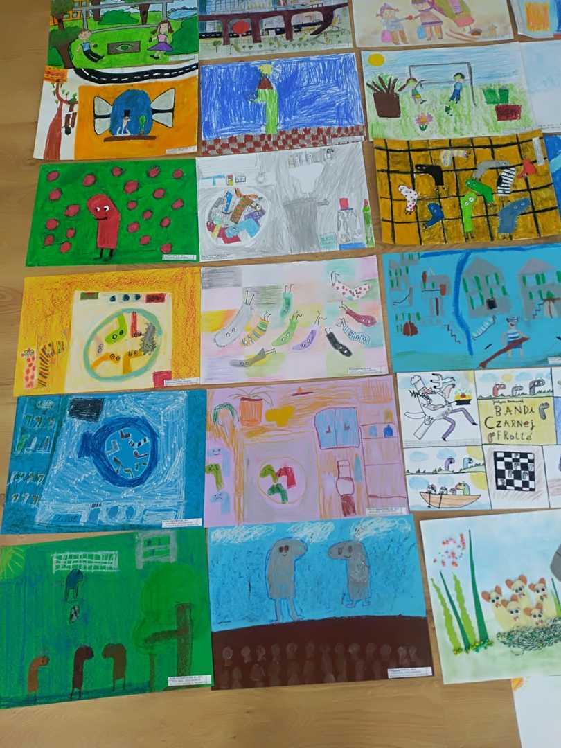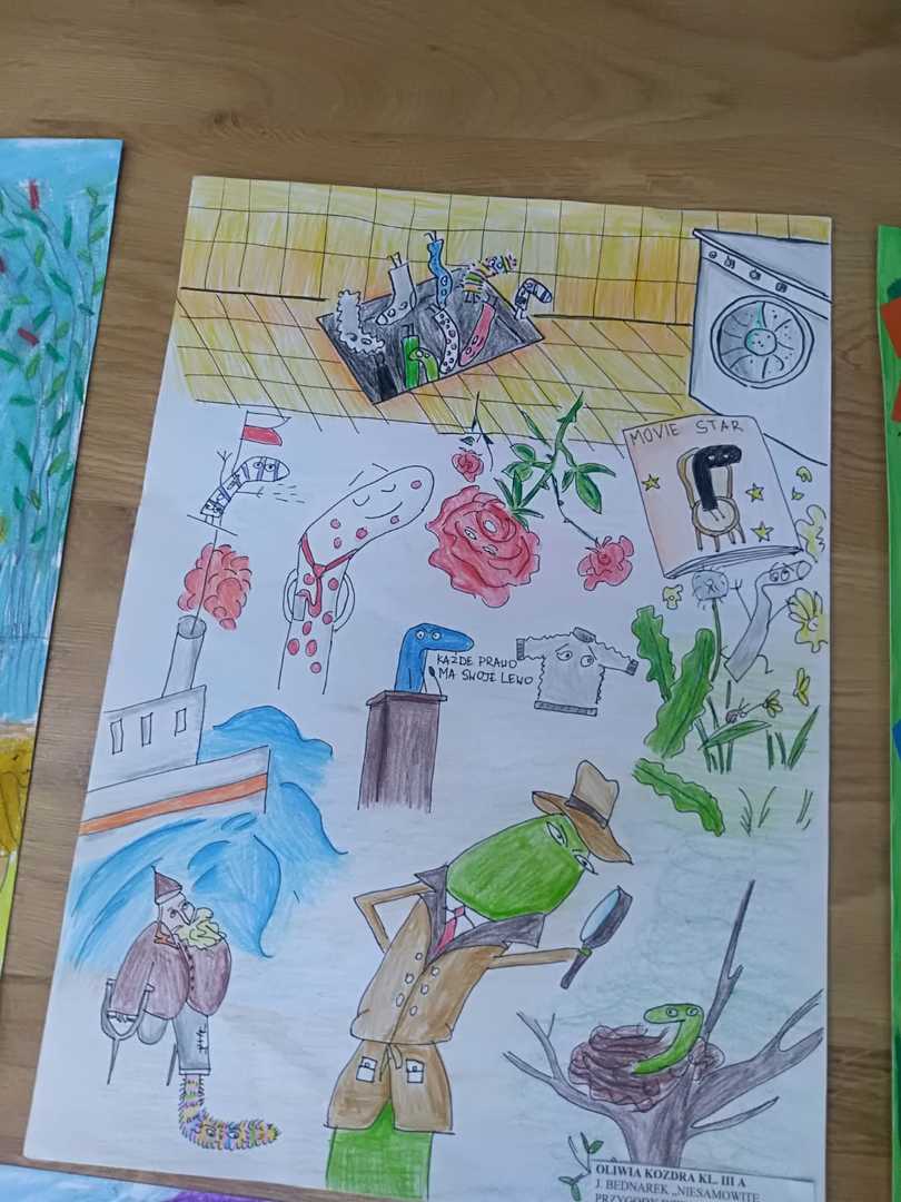 Zadaniem uczniów było przeczytanie wybranej książki Justyny Bednarek lub Grzegorza Kasdepke oraz wykonanie do niej ilustracji. Wpłynęło 51 prac plastycznych. Komisja w składzie: przewodnicząca - Dyrektor Renata Śrutwa-Krupa, członkowie - Monika Czernek, Barbara Wiśniewska oraz Ewa Wrzalik przyznała nagrody i wyróżnienia. Każdy z uczestników otrzymał dyplom, nagrodzeni i wyróżnieni - nagrody książkowe, kolorowanki i drobne upominki.
