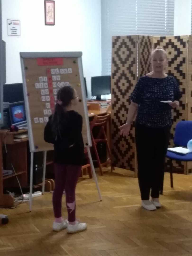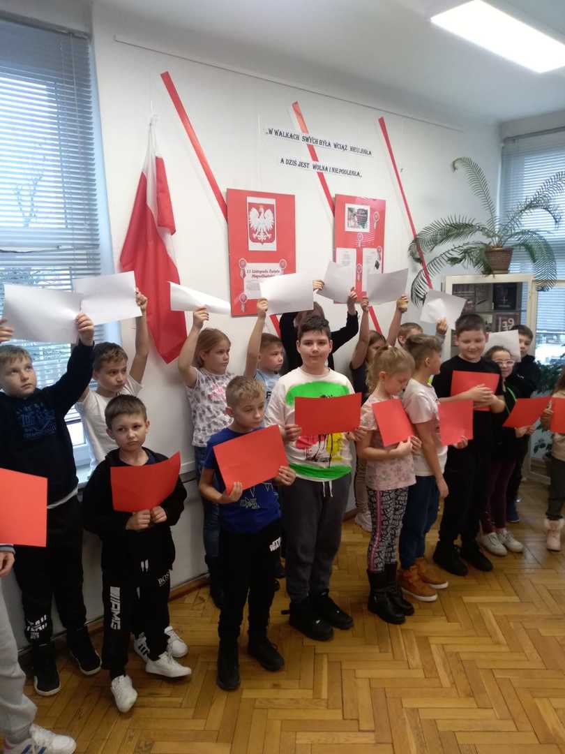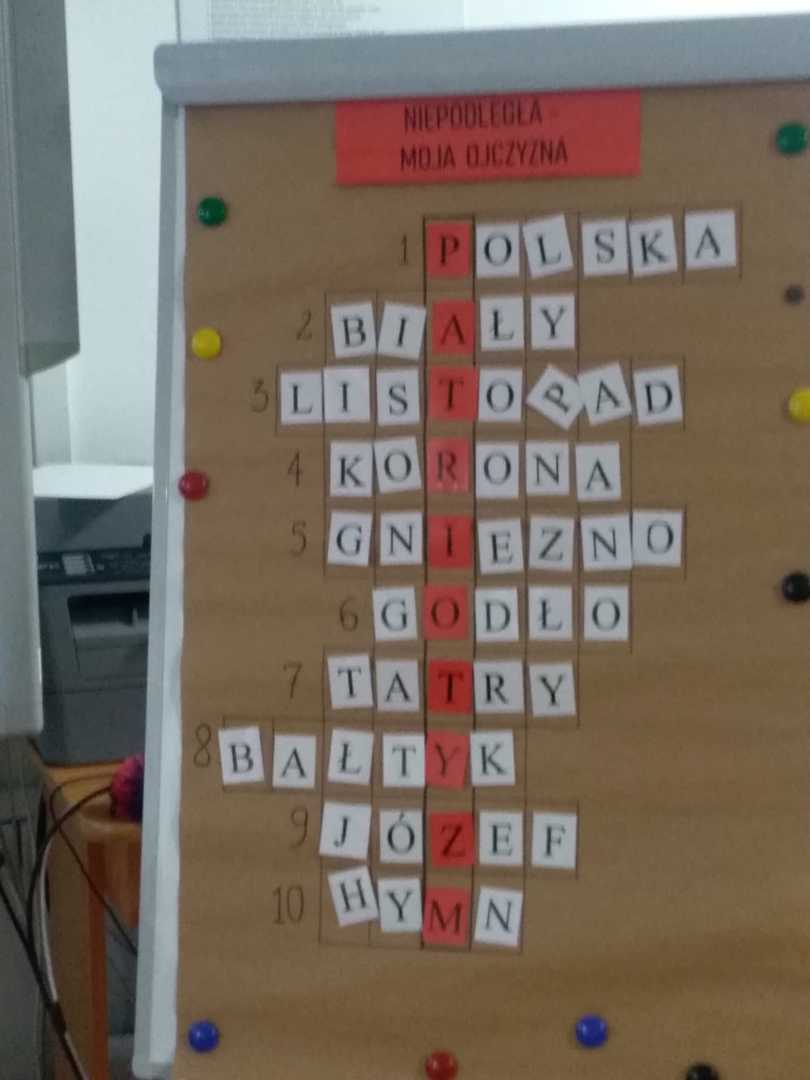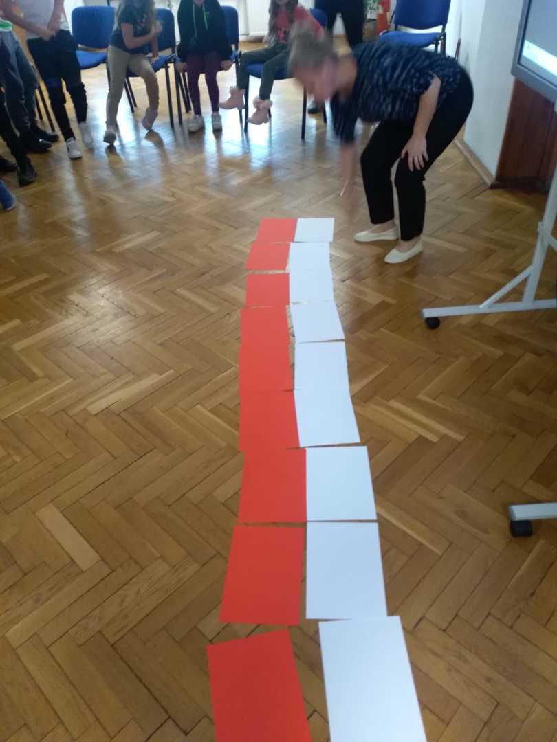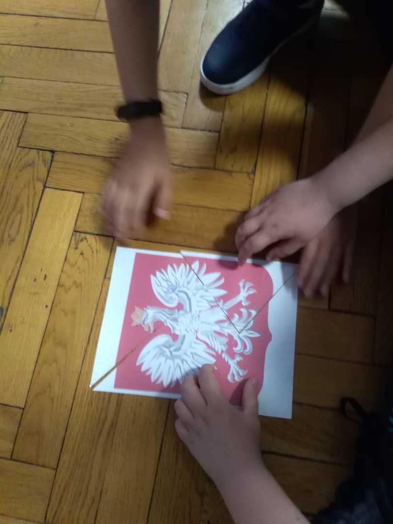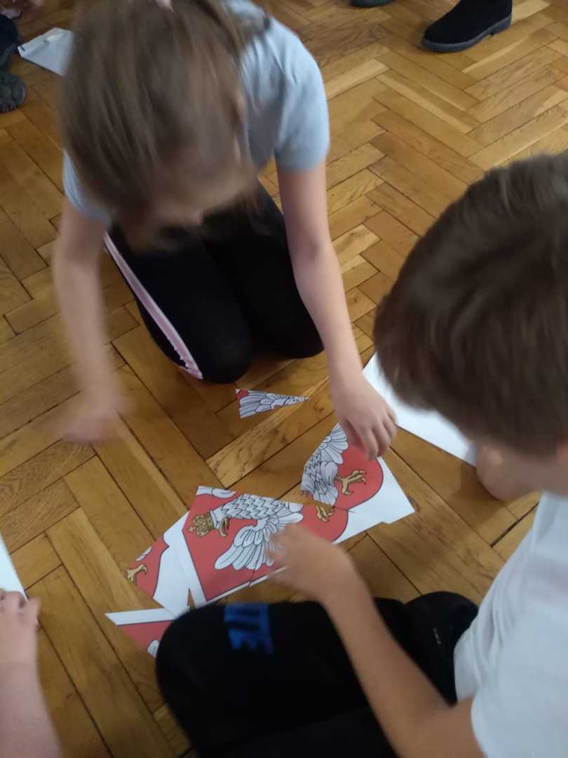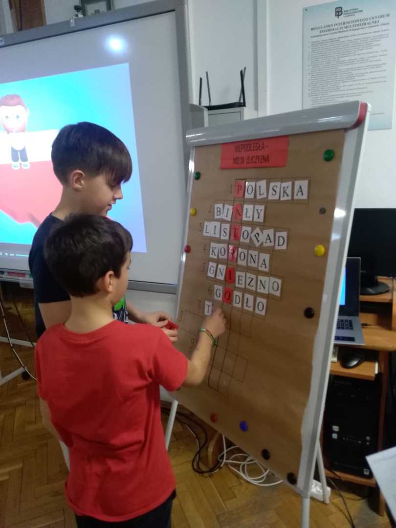 Mieliśmy przyjemność uczestniczyć w zajęciach w Bibliotece Miejskiej. Wspólnie obejrzeliśmy krótki film o powstaniu naszego państwa. Przypomnieliśmy sobie najważniejsze wydarzenia dotyczące godła, powstania hymnu, znaczenia flagi. Rozmawialiśmy o patronie naszej szkoły, czyli marszałku Józefie Piłsudskim. Z puzzli układaliśmy różne wizerunki naszego godła, które uporządkowaliśmy według dat ich rzeczywistego powstania. Rozwiązywaliśmy krzyżówkę, wymagającą wiedzy o naszym kraju. Na zakończenie odszukaliśmy kartki białe i czerwone ukryte w różnych miejscach biblioteki, z których ułożyliśmy flagę Polski. Zajęcia poprowadzone przez panie bibliotekarki upłynęły bardzo szybko. W bardzo ciekawy sposób uporządkowaliśmy naszą wiedzę o historii naszego państwa.