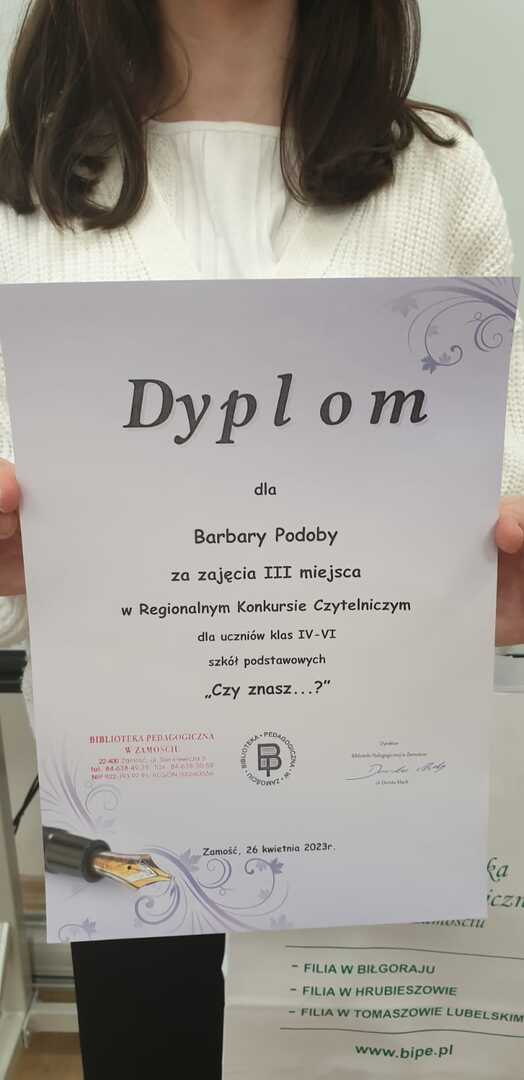 26 kwietnia 2023 r. w Bibliotece Pedagogicznej w Zamościu odbył się finał Regionalnego Konkursu Czytelniczego „Czy znasz” dla uczniów klas IV – VI szkół podstawowych powiatu zamojskiego, biłgorajskiego, hrubieszowskiego i tomaszowskiego. Zadaniem uczestników konkursu było samodzielne rozwiązanie testu wiedzy złożonego z 55 pytań przygotowanych w oparciu o utwory literackie, które uczestnicy musieli przeczytać. Miło nam poinformować, że nasza uczennica Barbara Podoba już od kilku lat bierze udział w tym konkursie czytelniczym i co roku jest jego finalistką i laureatką. Nie inaczej było w tym roku, Barbara Podoba zajęła III miejsce. Serdecznie gratulujemy.