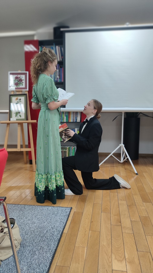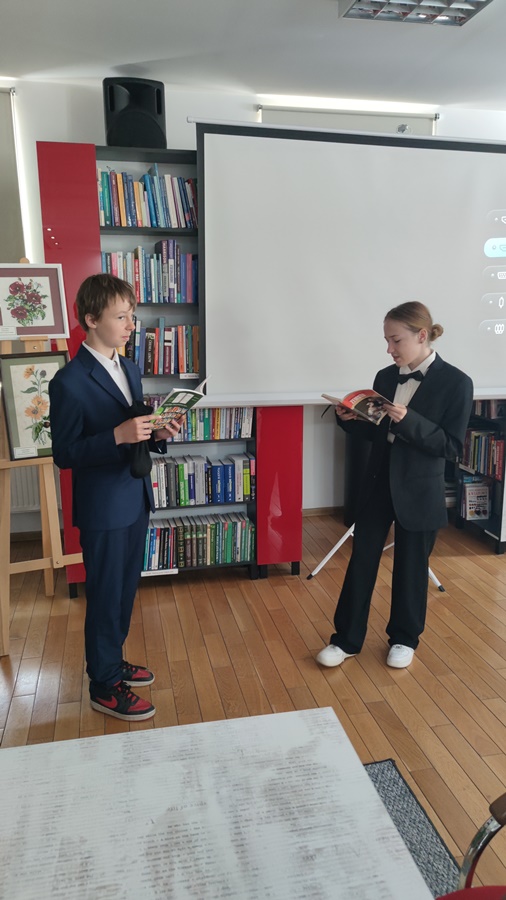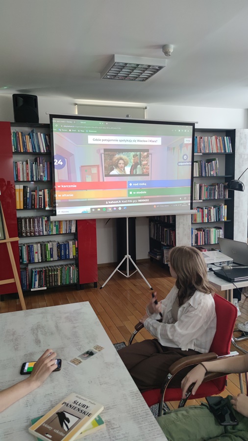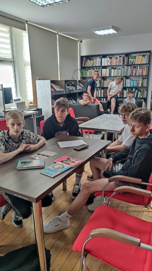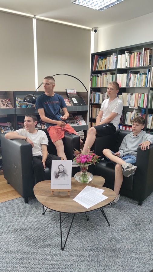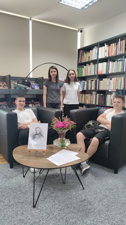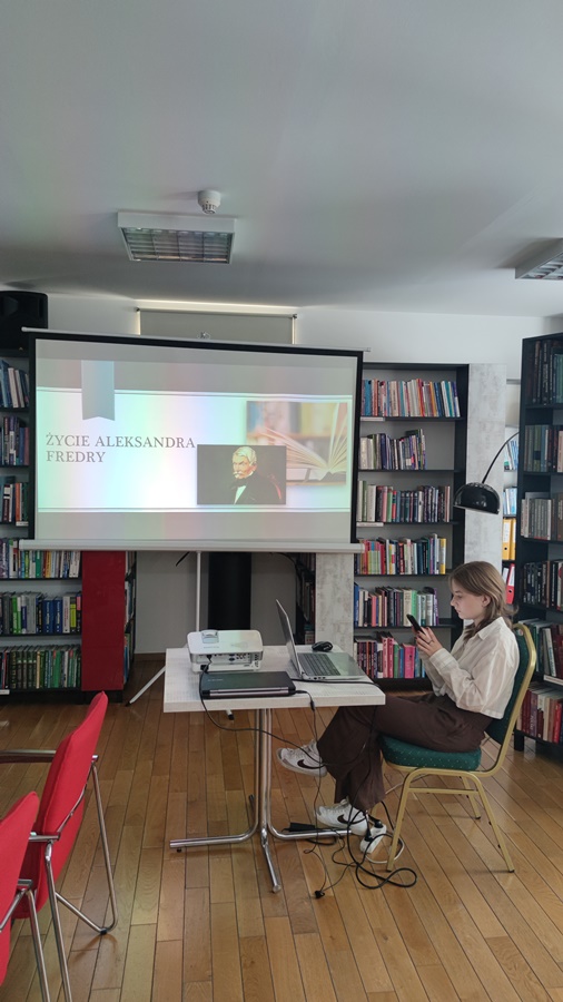 6 VI 2023 r. uczniowie klasy VIII d przybyli do Miejskiej Biblioteki Publicznej, by poprowadzić zajęcia poświęcone Aleksandrowi Fredrze, gdyż jak wiadomo, rok 2023 jest rokiem tego znanego dramatopisarza. Uczniowie przygotowali i przedstawili prezentację poświęconą autorowi „Ślubów panieńskich”, ciekawostki z życia Fredry. Mogliśmy obejrzeć dwie scenki z „Zemsty” – dialog Klary z adorującym ją Papkinem oraz scenę, w której Wacław oddaje się Papkinowi w niewolę. Zajęcia zakończyły quizy na Kahoocie, sprawdzały one znajomość „Zemsty” (lektury obowiązkowej), wiedzę z zakresu rodzajów literackich i przyswojenie faktów z życia Aleksandra Fredry.