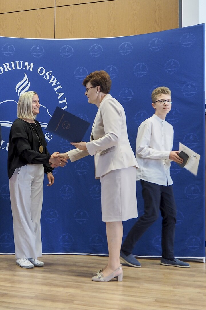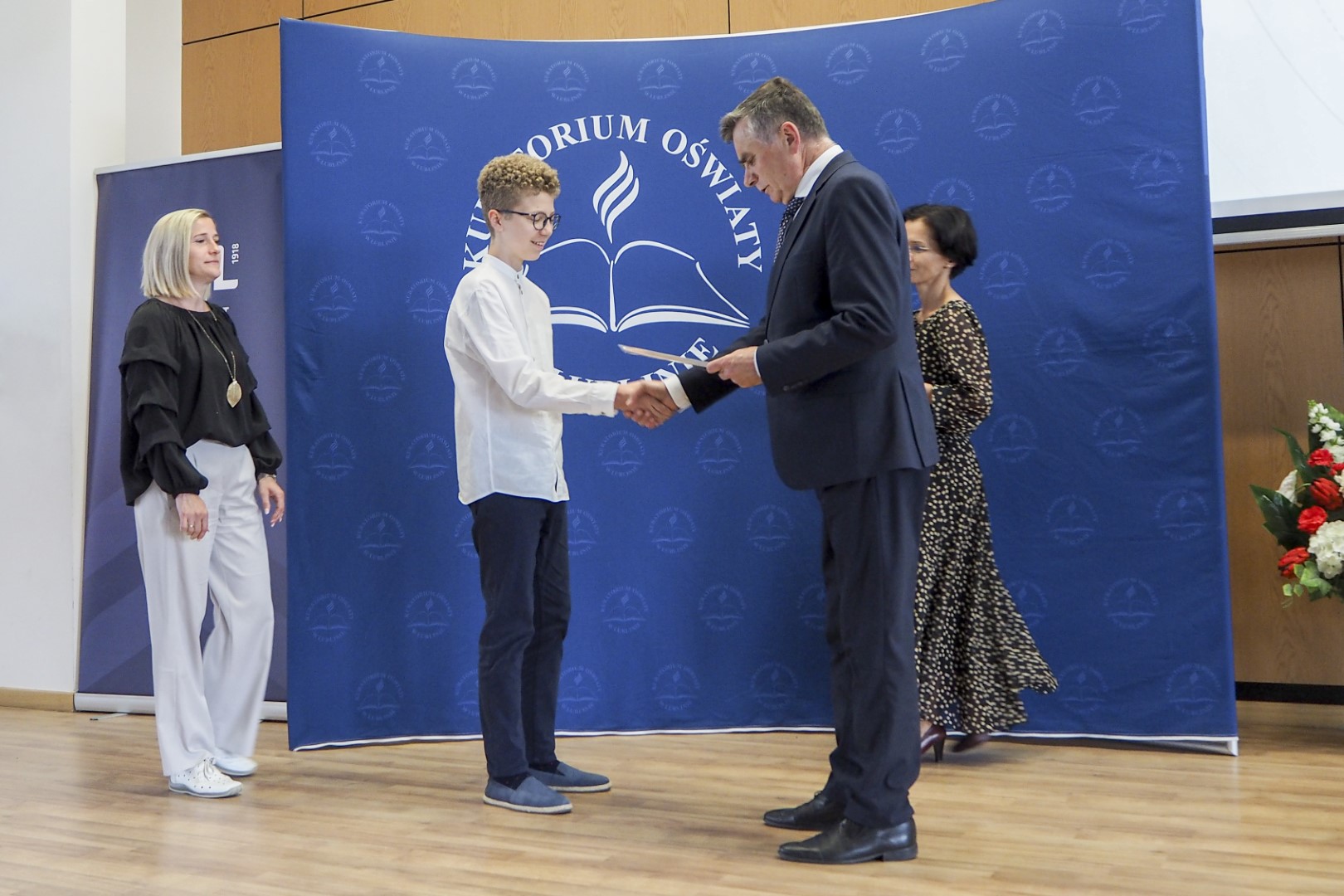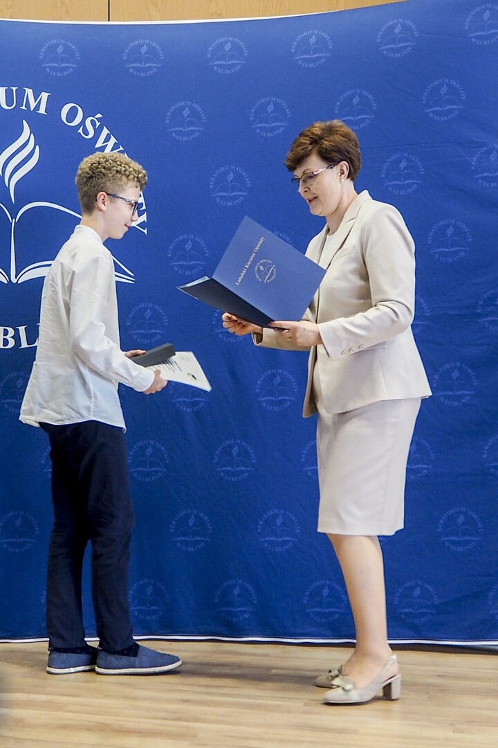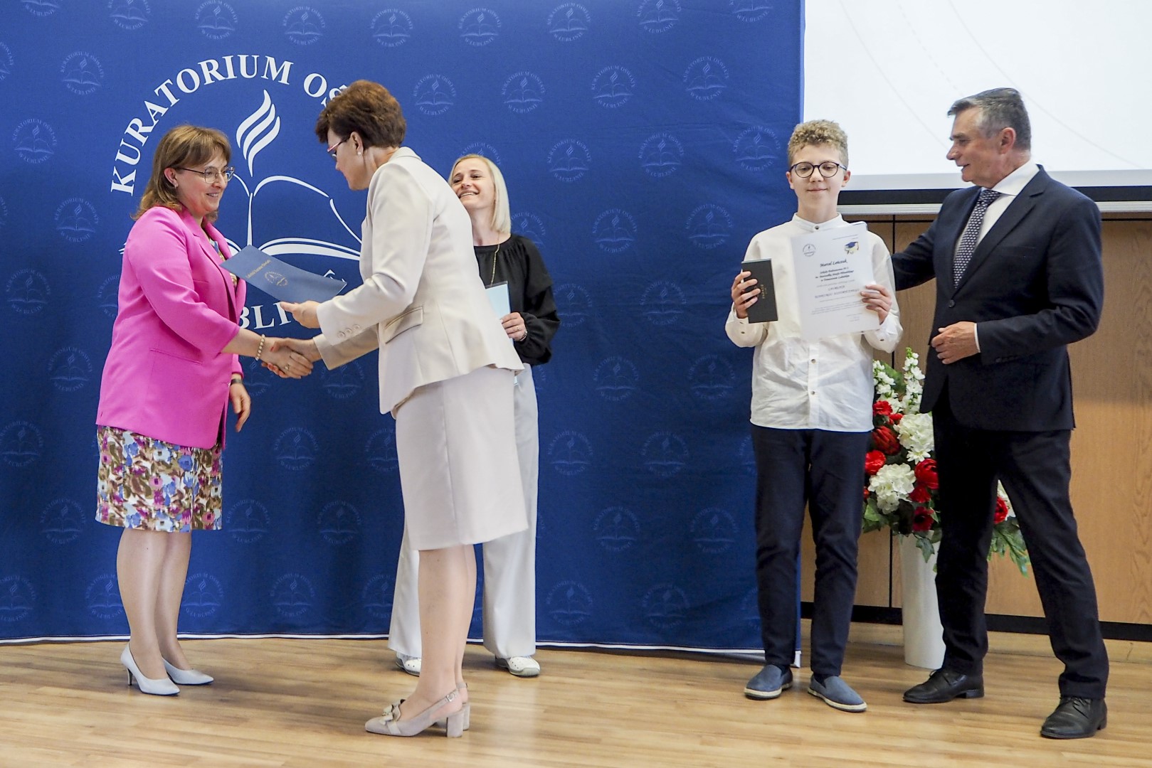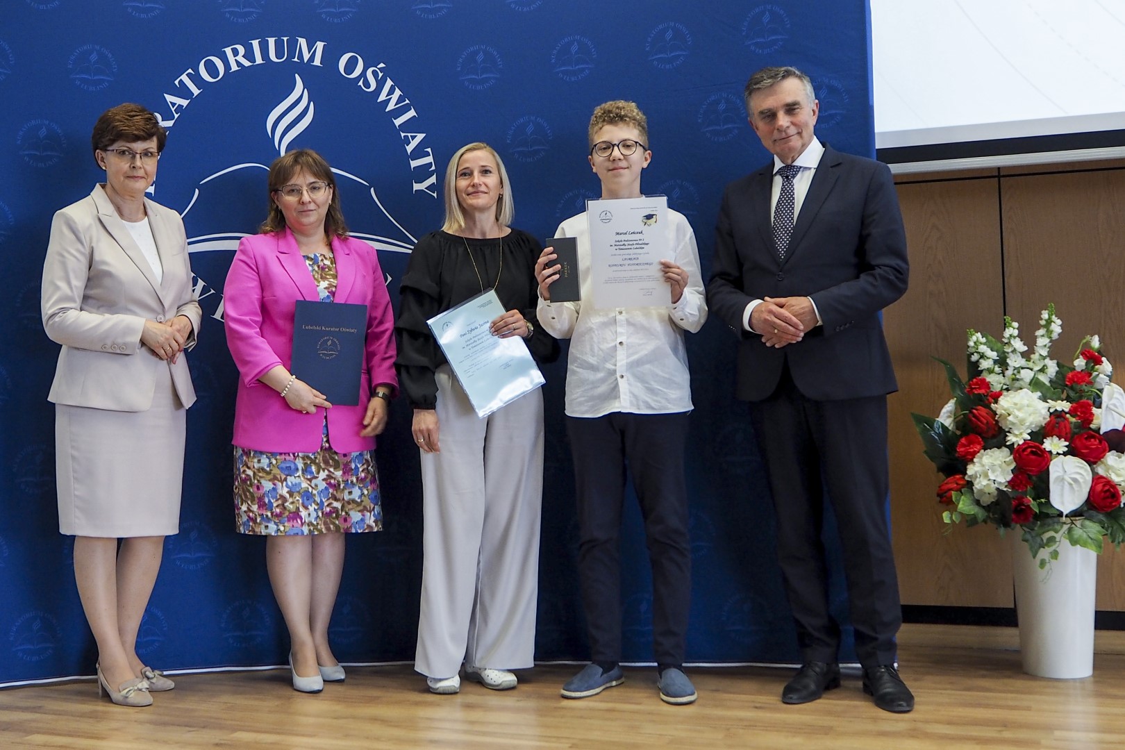 Z wielką radością i dumą informujemy, że Marcel Leńczuk w dniu 12 czerwca 2023 r. odebrał w Lublinie gratulacje z rąk Lubelskiego Kuratora Oświaty Pani Teresy Misiuk oraz Wojewody Lubelskiego Pana Lecha Sprawki z racji uzyskania tytułu Laureata w Konkursie Historycznym. Jest on dopiero uczniem klasy VI, a już ma na swoim koncie duże osiągnięcia w wielu konkursach na różnym szczeblu. Marcelowi w tej uroczystej gali towarzyszyła Pani Sylwia Jasina, która przygotowywała go do konkursu, Pani Dyrektor oraz Rodzice. Mamy nadzieję, że Marcel jeszcze nie raz da o sobie usłyszeć i będziemy mogli gratulować mu sukcesów. Warto dodać, że był on jedynym w tym roku Laureatem z Tomaszowa. Brawo Marcel! Tak trzymaj!