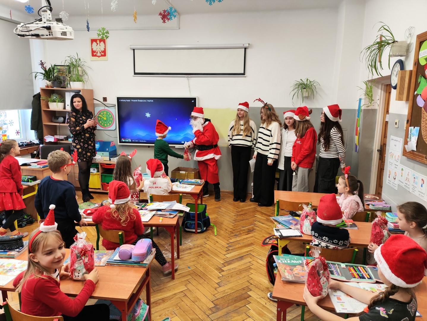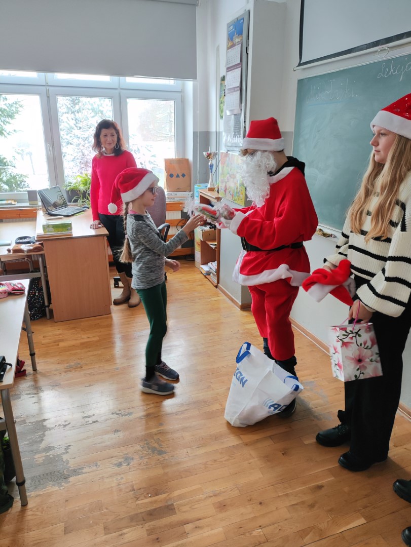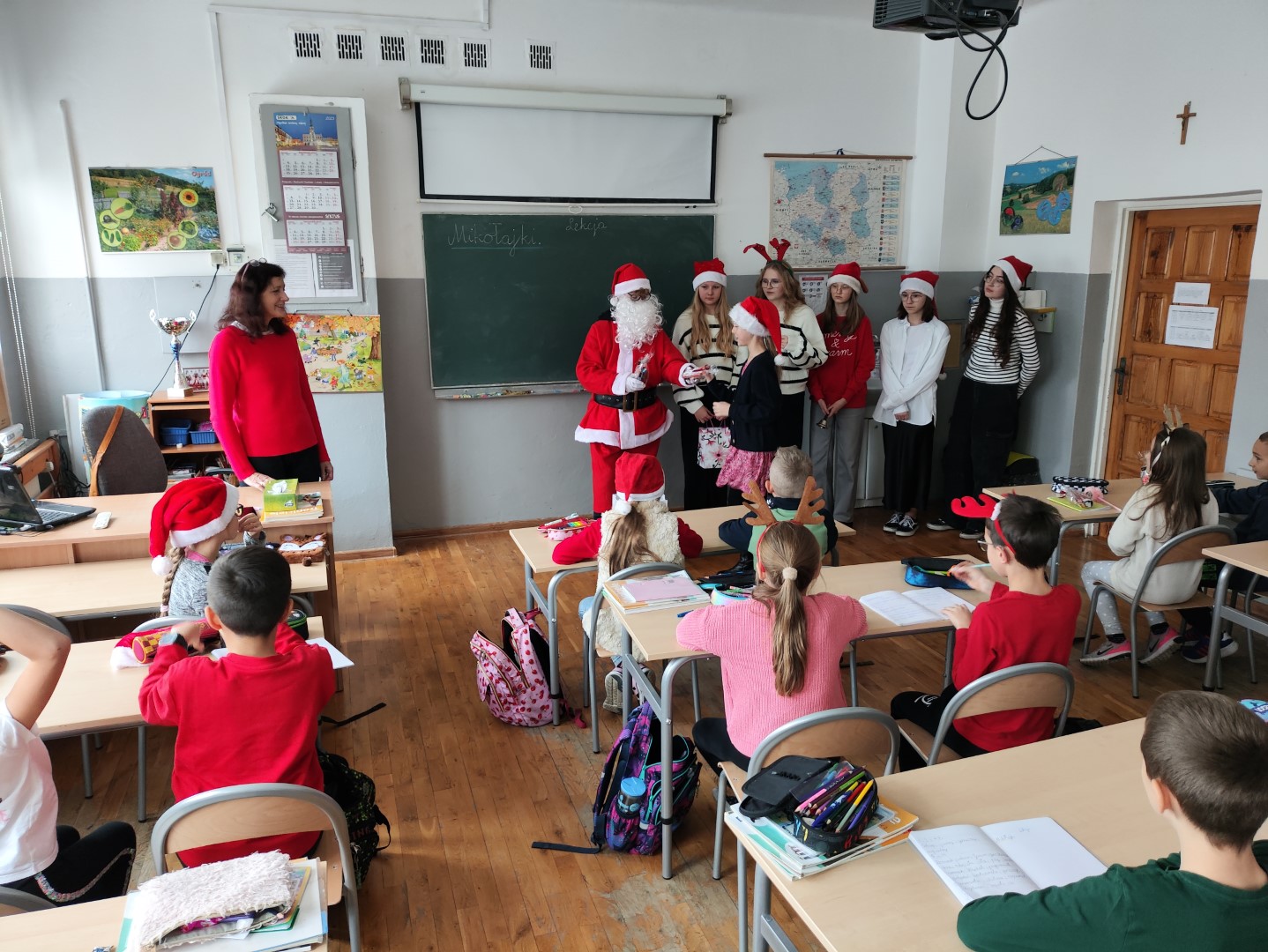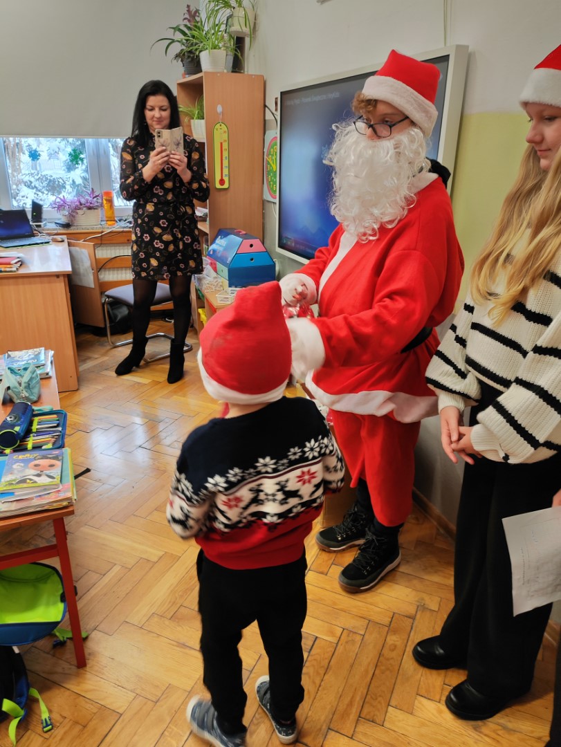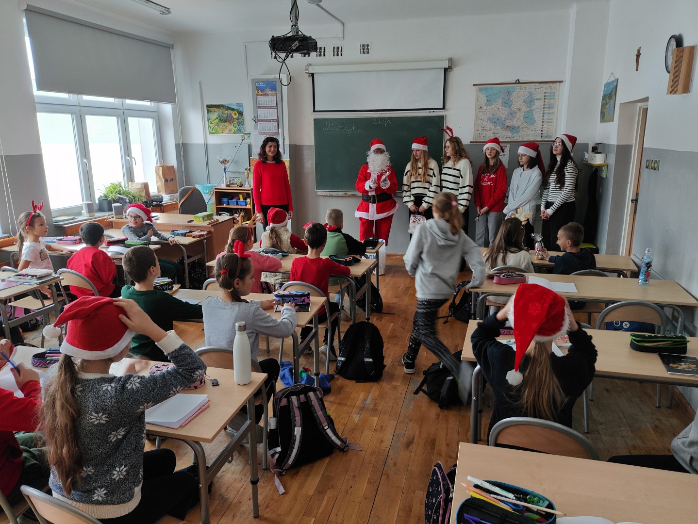 Szósty grudnia to data, którą zna każde dziecko i każdy dorosły. Mikołajki w naszej szkole już na stałe wpisały się w kalendarz wydarzeń. W tym roku również nie zabrakło radości i uśmiechów. Wszyscy uczniowie ubrani byli dziś w stroje z akcentem mikołajkowym a Samorząd Uczniowski w strojach elfów i Świętego Mikołaja obdarowywał prezentami uczniów i nauczycieli.