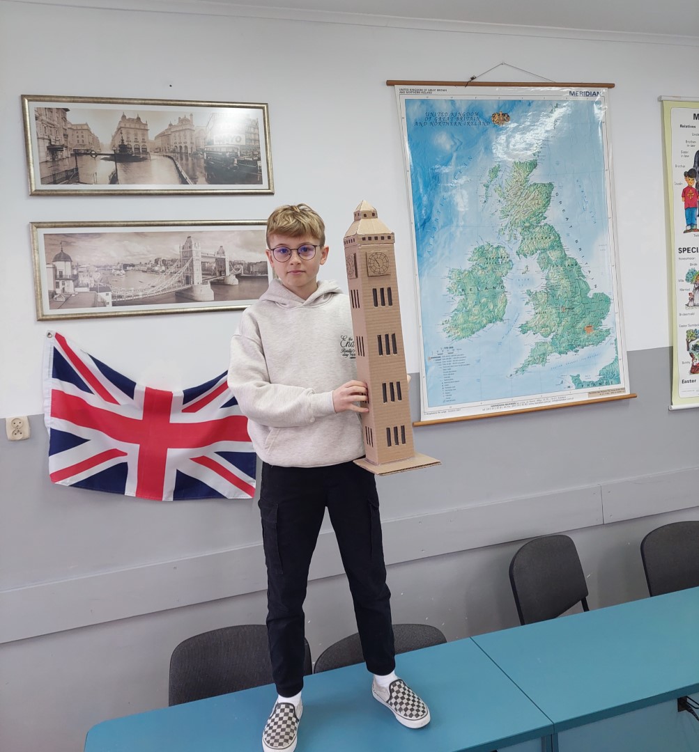 Uczniowie klasy V „a” zrealizowali projekt edukacyjny, w ramach którego, kierując się kreatywnością i pomysłowością, wykonali przepiękne makiety budynków oraz charakterystycznych motywów pochodzących z krajów anglojęzycznych. To zadanie wymagało od nich pomysłowości, dokładności i cierpliwości. Z niebywałą precyzją przedstawili nawet najdrobniejsze szczegóły budowli takich jak: London Eye, Big Ben, most Golden Gate, a także miniaturowe filiżanki i insygnia władzy. Nie zabrakło również słynnego czerwonego autobusu, budki telefonicznej oraz gwardzisty królewskiego. Ich makiety są dowodem na to, że nauka może być nie tylko pouczająca, ale także bardzo zabawna! Cieszy nas fakt, że uczniowie wykazali się takim zaangażowaniem i twórczością.