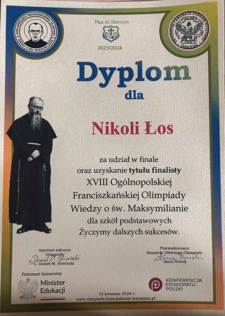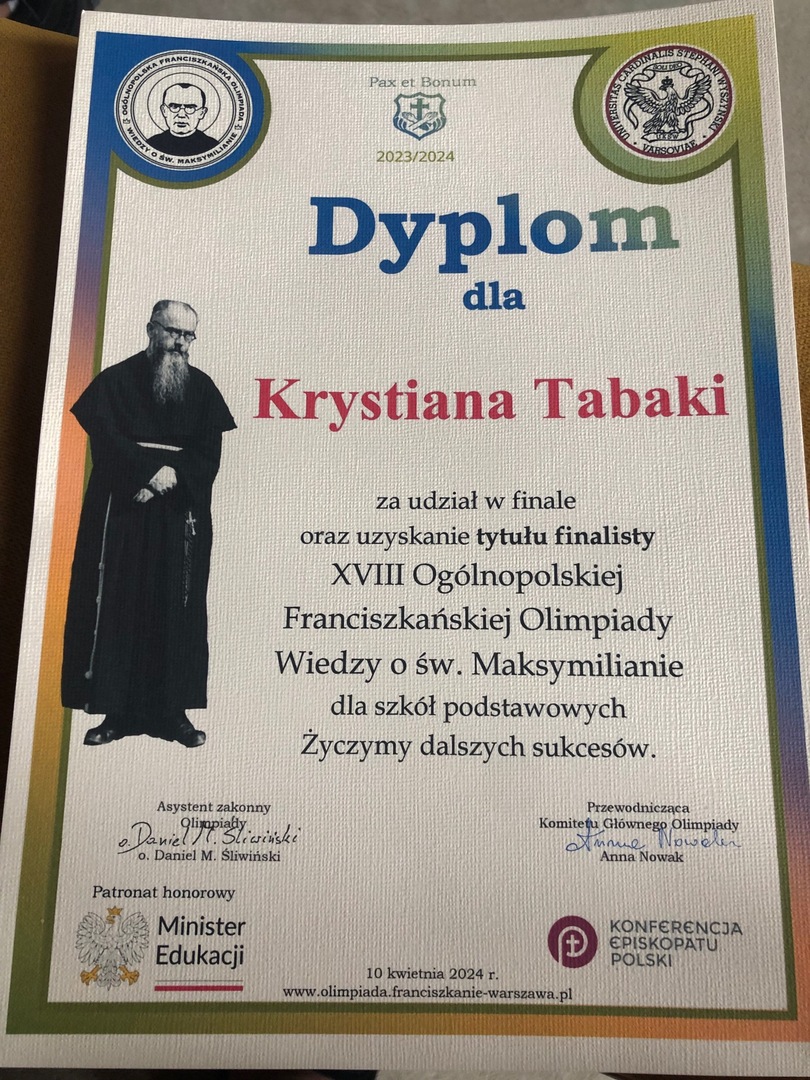 Nikola Łos i Krystian Tabaka uczniowie klasy 7a, zostali Finalistami XVIII Ogólnopolskiej Franciszkańskiej Olimpiady Wiedzy o św. Maksymilianie pod patronatem Ministra Edukacji i Nauki oraz KWK przy Konferencji Episkopatu Polski. Olimpiada przebiegała w trzech etapach: szkolnym, diecezjalnym oraz ogólnopolskim, który odbył się 10 kwietnia 2024 r. w Siedlcach. Uczniowie musieli gruntownie znać życiorys św. Maksymiliana, zapoznać się z książką Marii Kączkowskiej „Ojciec Kolbe” oraz poznać bardzo wnikliwie Dzieje Apostolskie. W finale udział wzięło 84 uczniów ze szkół podstawowych, naszym siódmoklasistom zabrakło kilku punktów aby znaleźć się piątce laureatów.