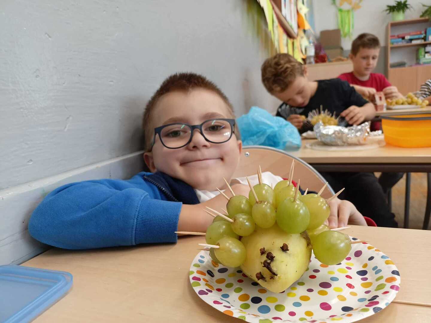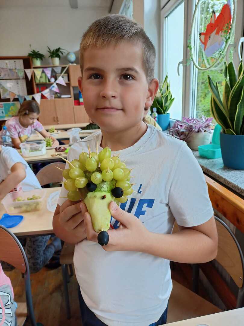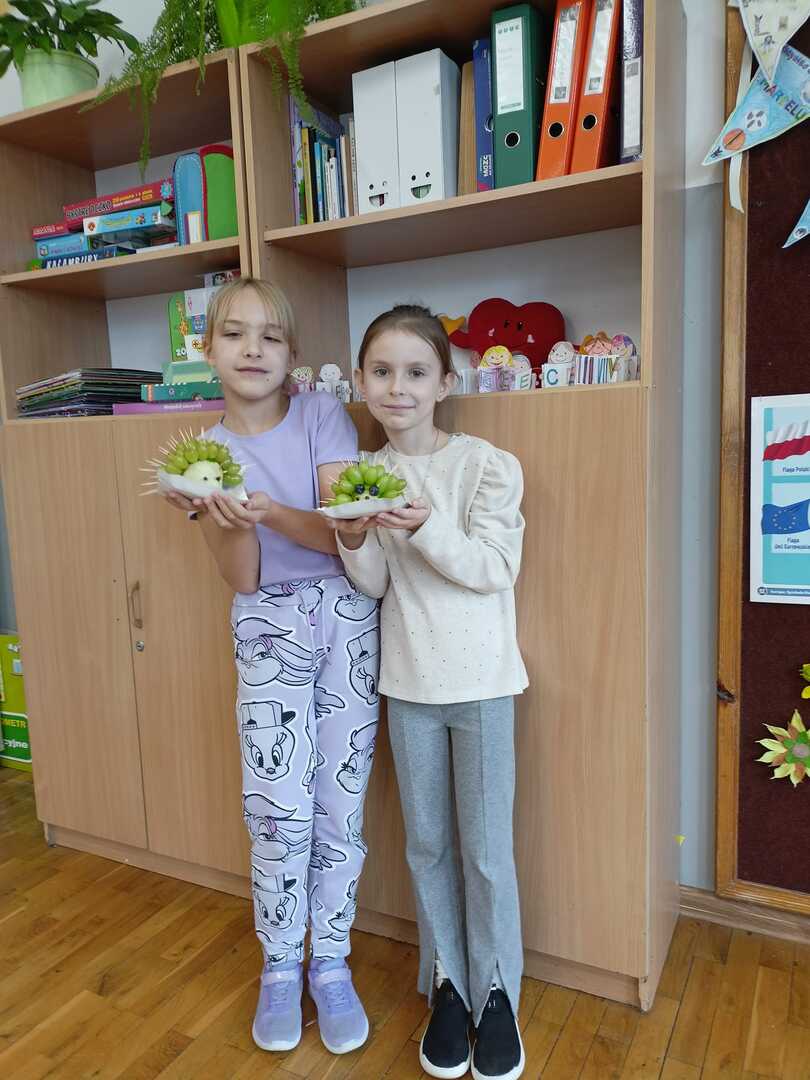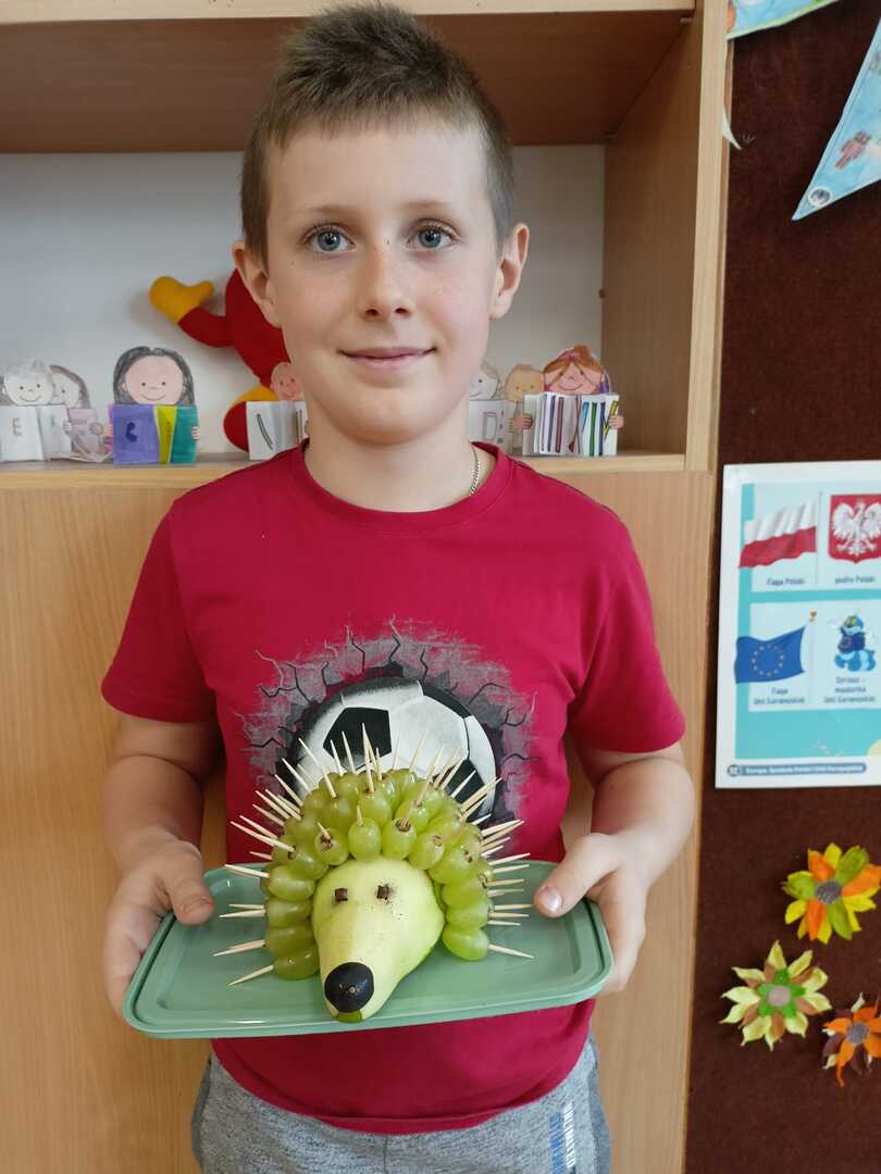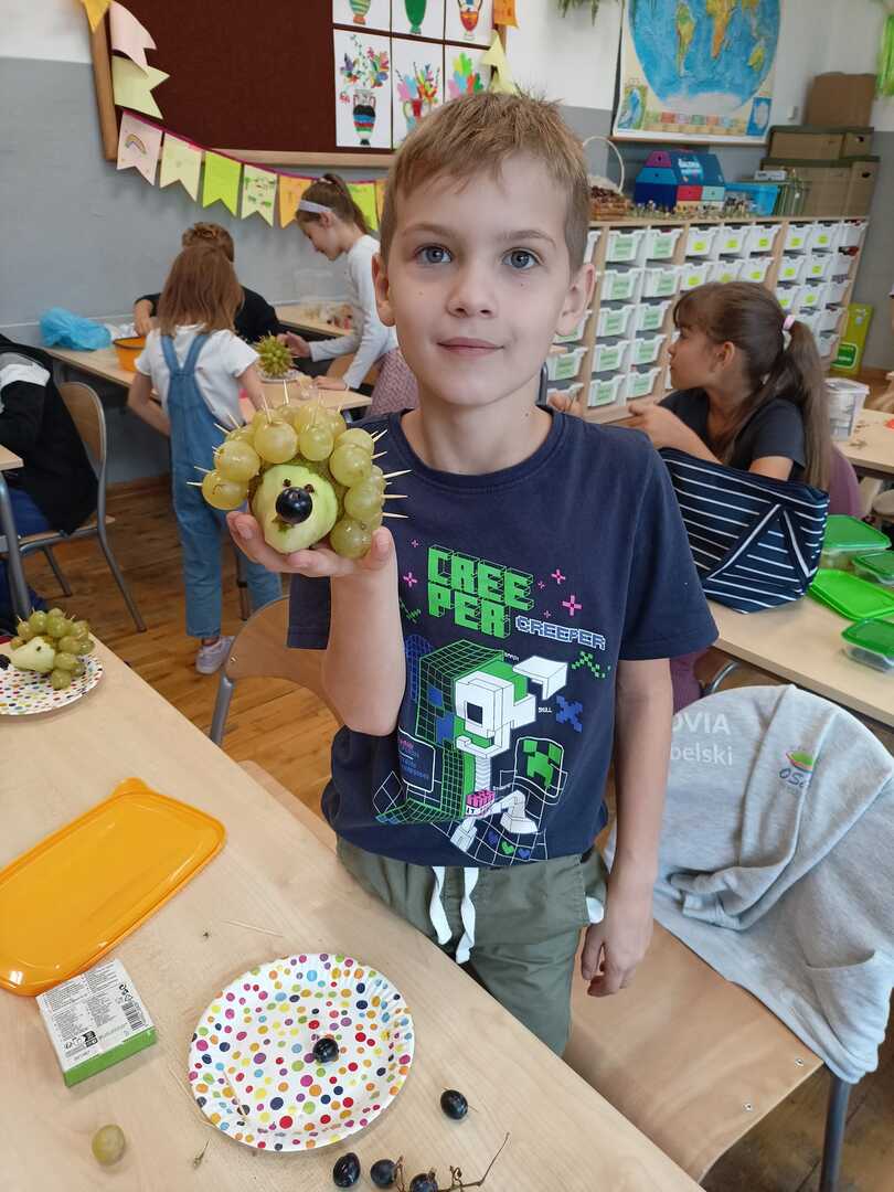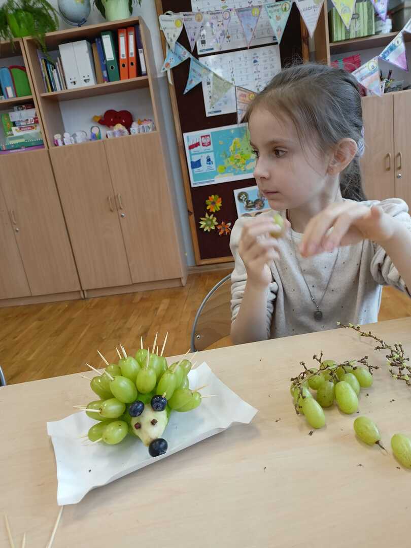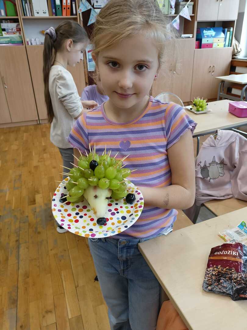 Uczniowie klasy II b podczas zajęć przygotowali wspaniałe owocowe jeże. Pierwsze kulinarne doświadczenia za nami. Było wesoło i pysznie.