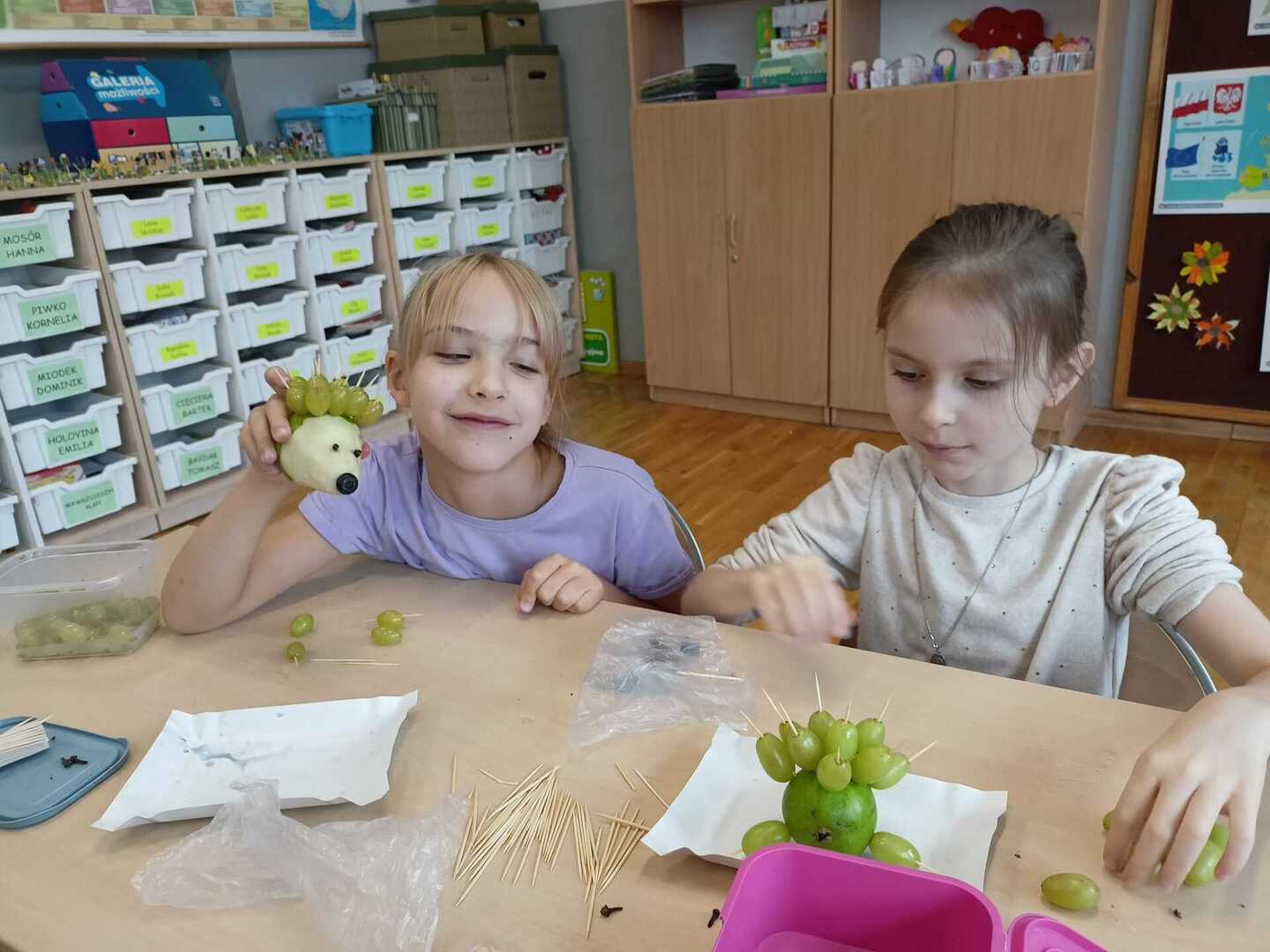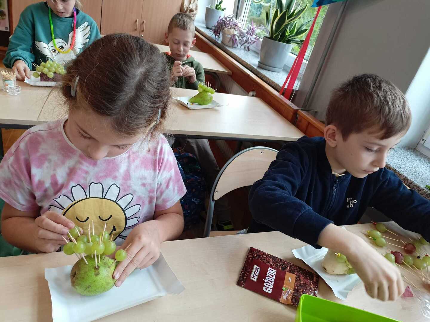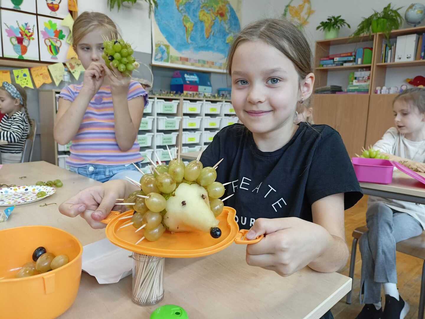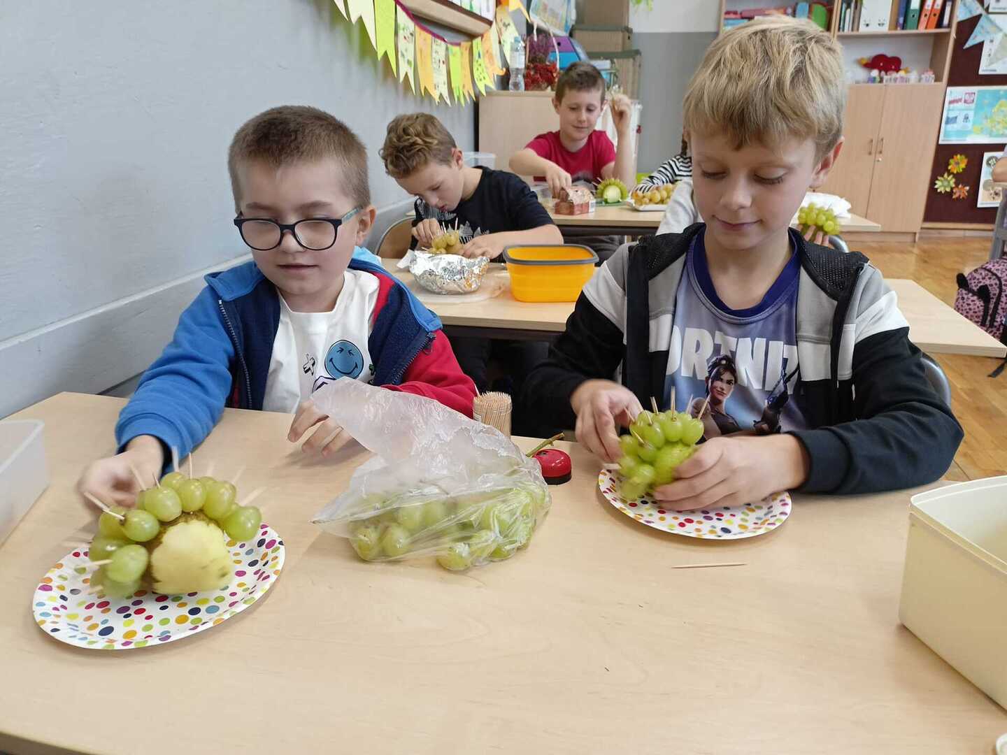 Uczniowie klasy II b podczas zajęć przygotowali wspaniałe owocowe jeże. Pierwsze kulinarne doświadczenia za nami. Było wesoło i pysznie.