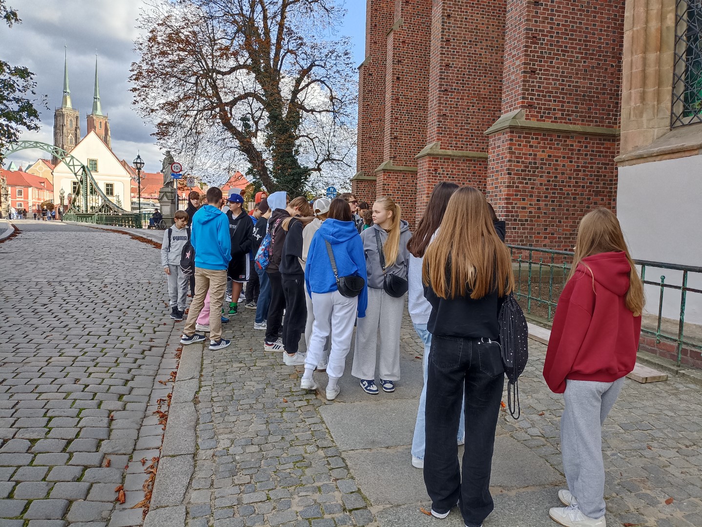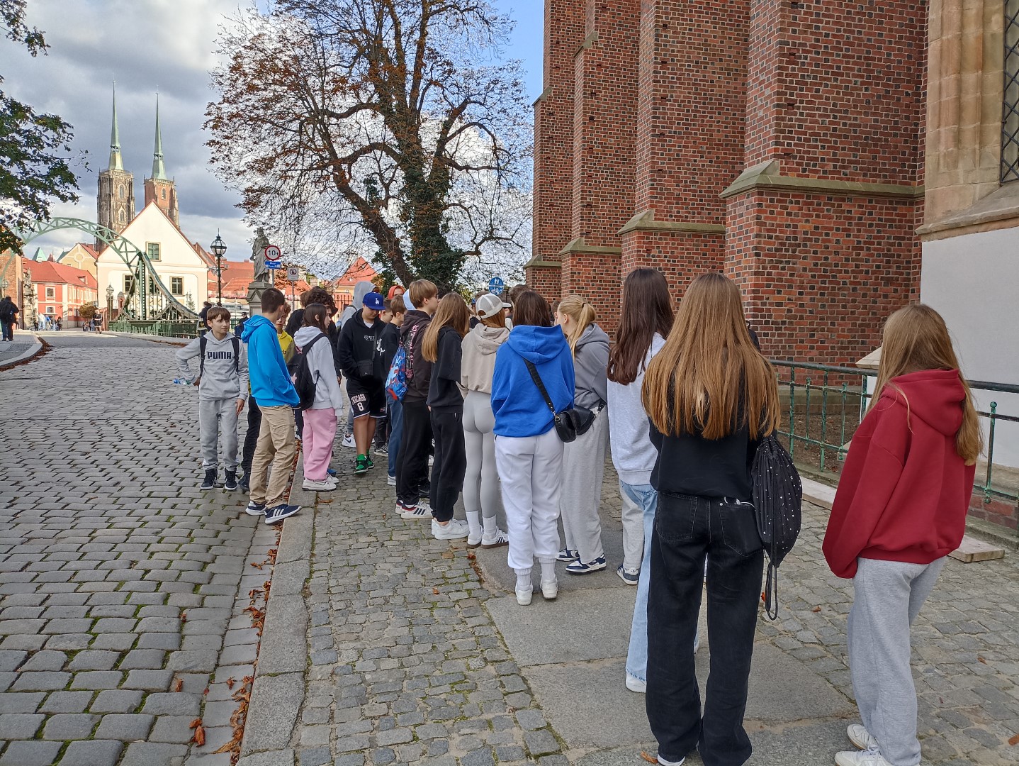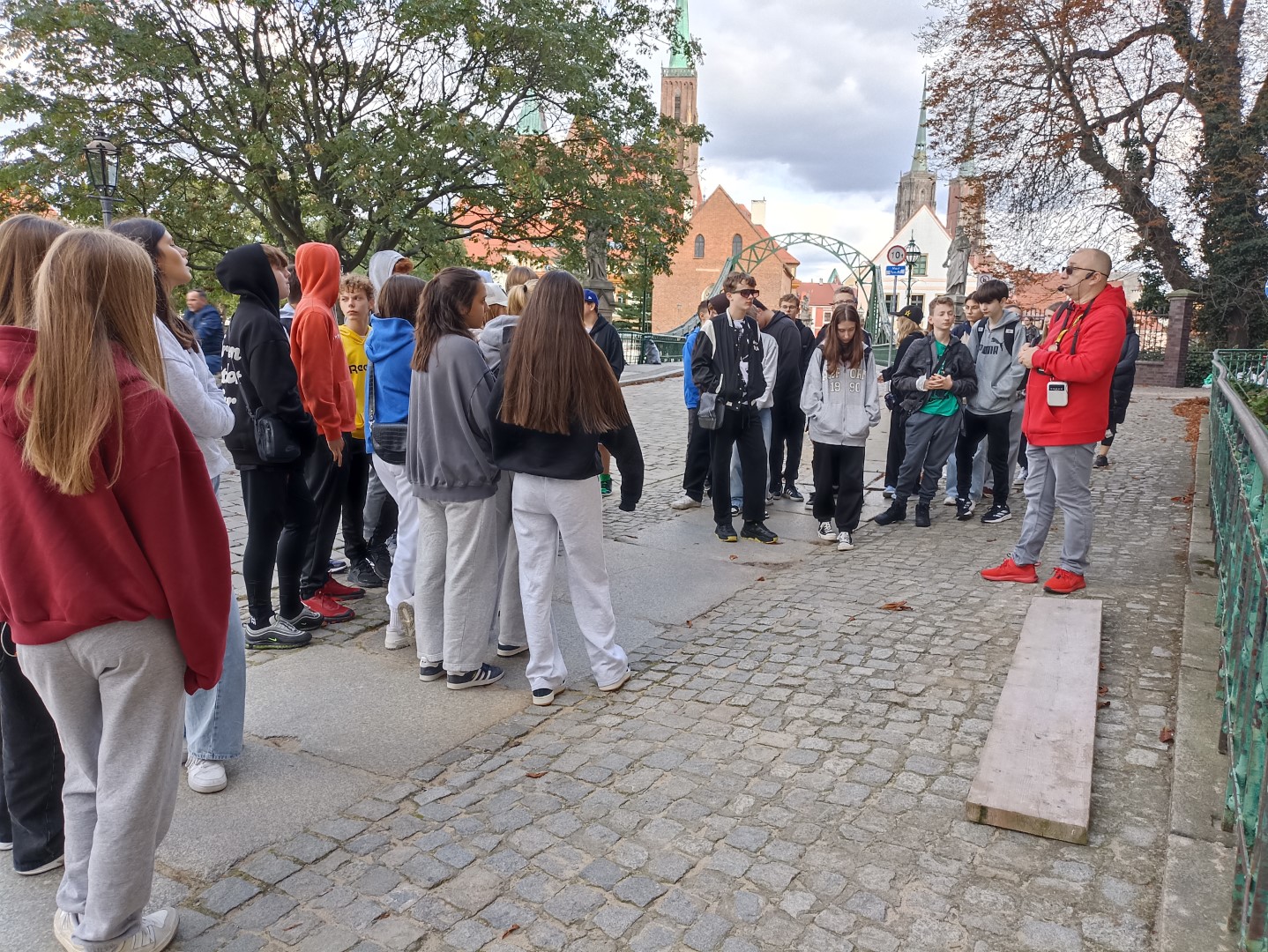 Na przełomie września i października klasy 8 „a” i 8 „c” pojechały na wycieczkę do Wrocławia i Oświęcimia. Wyjazd zaplanowany był jeszcze w ubiegłym roku, a koszty wycieczki zostały pokryte z pieniędzy programu Ministerstwa Edukacji Narodowej „Wycieczka z klasą”. Zaplanowaliśmy bardzo bogaty program, który udało się zrealizować dzięki wsparciu MEN. Wrocław urzekł nas swoim pięknem, choć wszędzie jeszcze było widać zabezpieczenia przed powodzią. Podczas wycieczki byliśmy w Muzeum Czterech Kopuł, gdzie oglądaliśmy wystawę współczesnego malarstwa i rzeźby. Wzięliśmy udział w lekcji „szalonego naukowca”, który pokazywał doświadczenia z ciekłym azotem. Przy okazji widzieliśmy rekwizyty popularnych filmów, a to wszystko działo się w Movie Gate na wrocławskiej starówce. Urzekła nas również Panorama Racławicka. Doskonale bawiliśmy się także we wrocławskim zoo grodzie zoologicznym, w którym odpoczęliśmy od wielu „artystycznych” wrażeń. Trzeciego dnia zwiedzaliśmy Muzeum Auschwitz – Birkenau w Oświęcimiu i Brzezince, które, tak różne od wcześniejszych doświadczeń, zrobiło na nas ogromne i przygnębiające wrażenie. Bogaty program wycieczki został zrealizowany w całości. Zmęczeni, ale i zadowoleni wróciliśmy do szkolnych obowiązków. 😄
