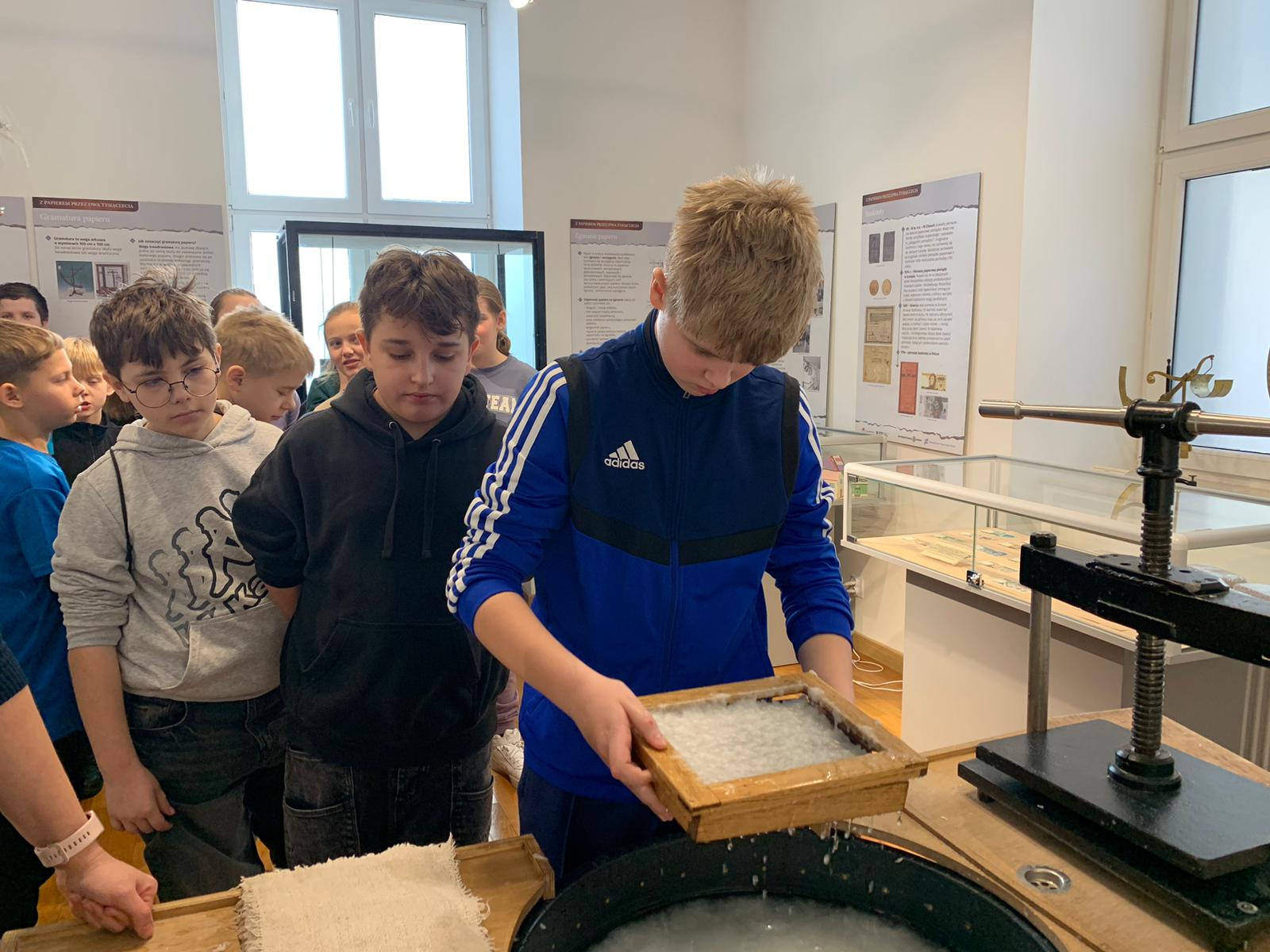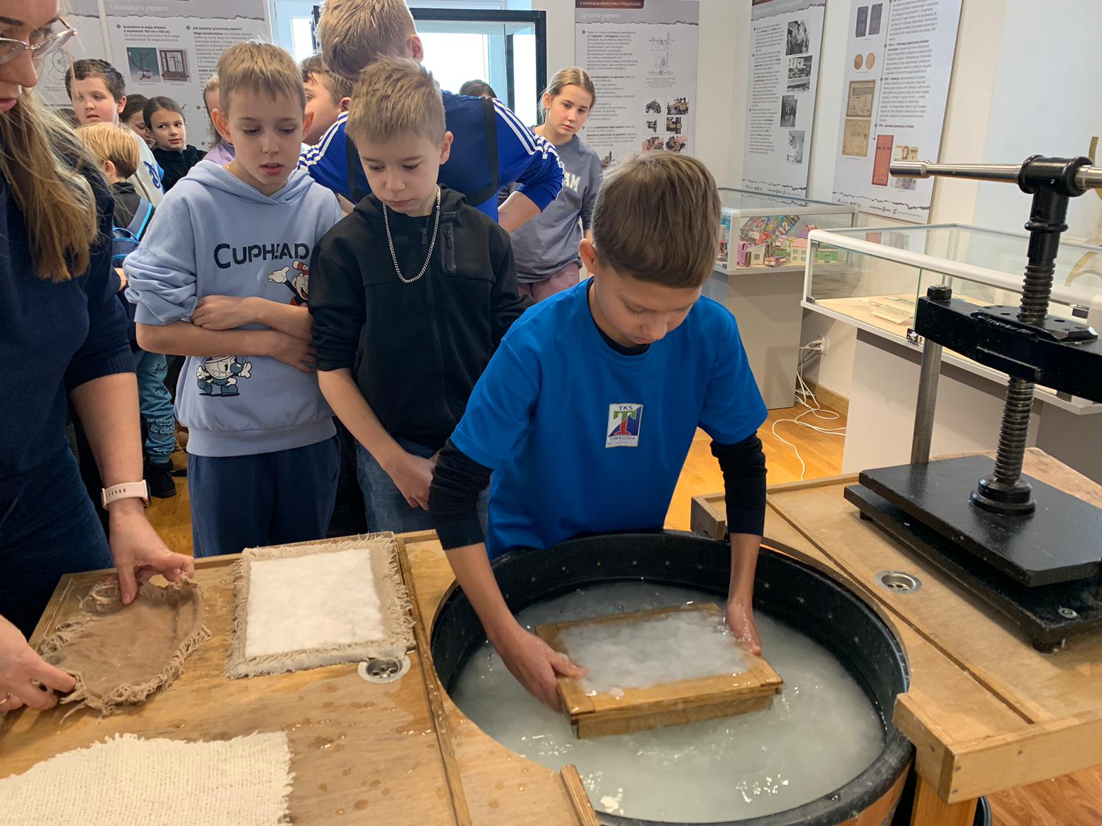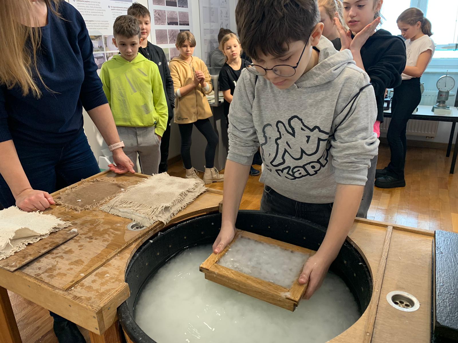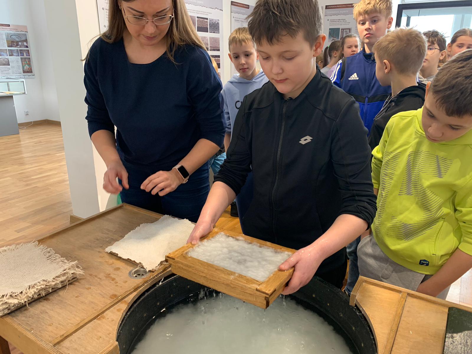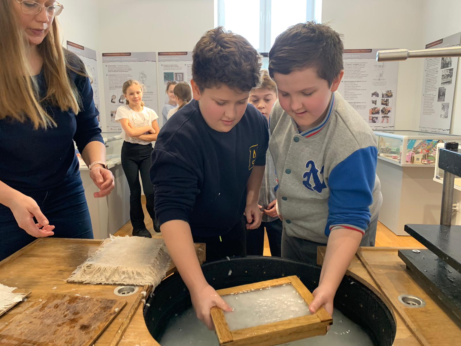 W dniu 23 stycznia uczniowie klasy 4C wraz z wychowawczynią Anną Kijko wzięli udział w ciekawych warsztatach czerpania papieru na terenie Muzeum Regionalnego w Tomaszowie Lubelskim. Uczniowie mieli niecodzienną okazję do utworzenia kartki papieru metodą czerpania rozpuszczonej w wodzie celulozy. Była to nie lada zabawa i ciekawe doświadczenie. Wytwory własne uczniowie zabrali do domu.