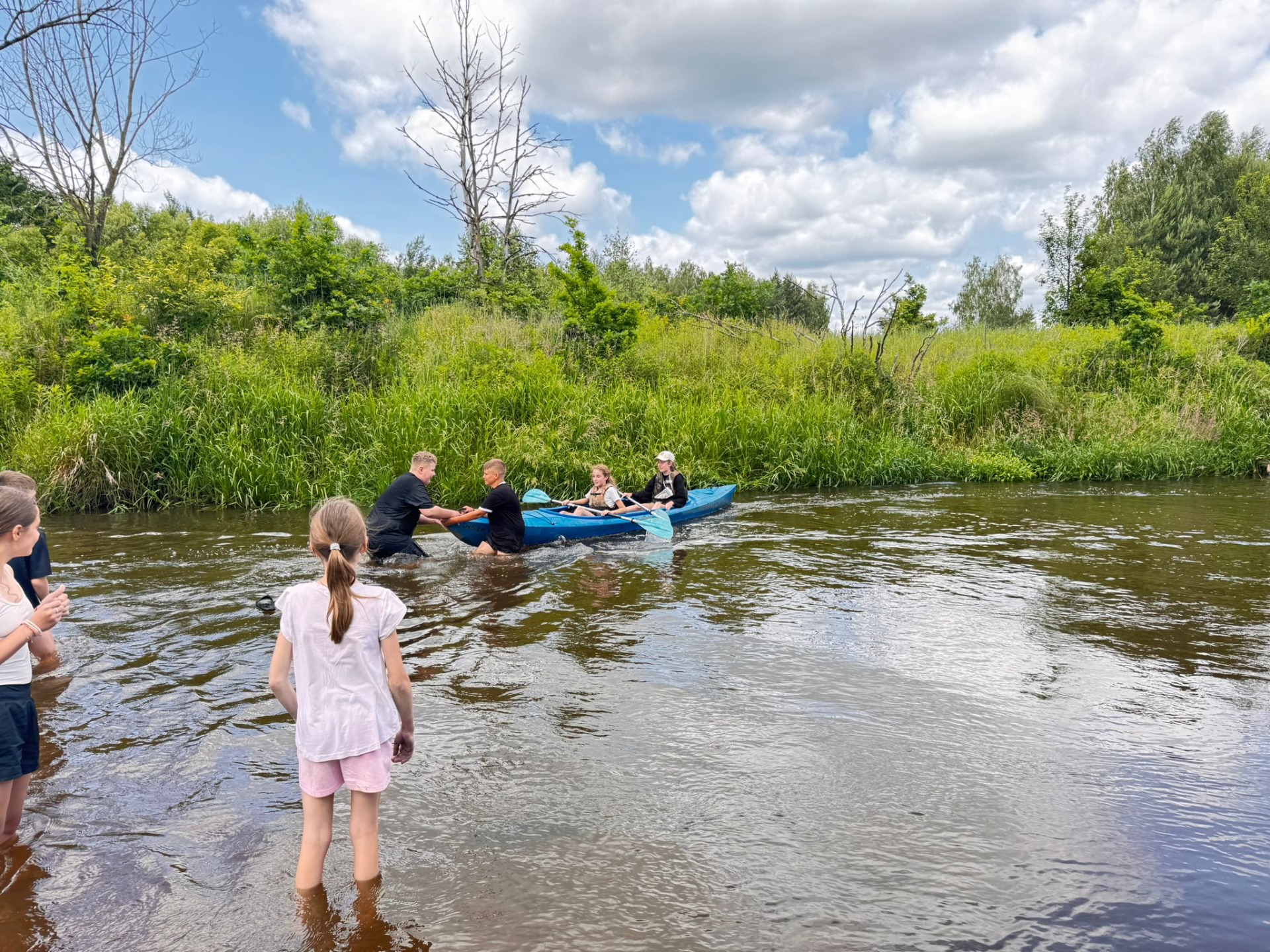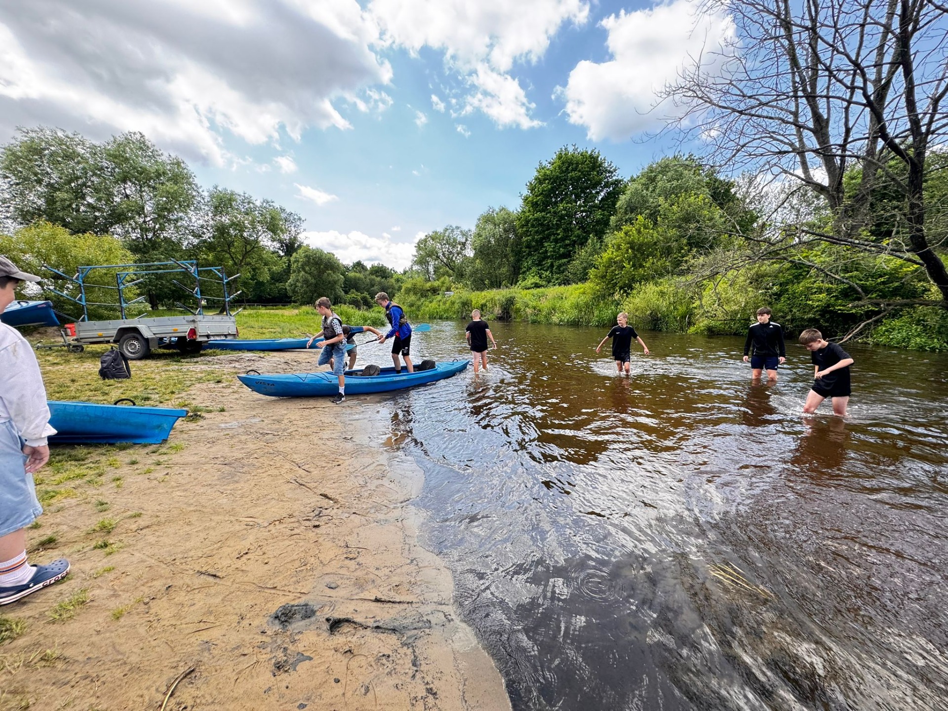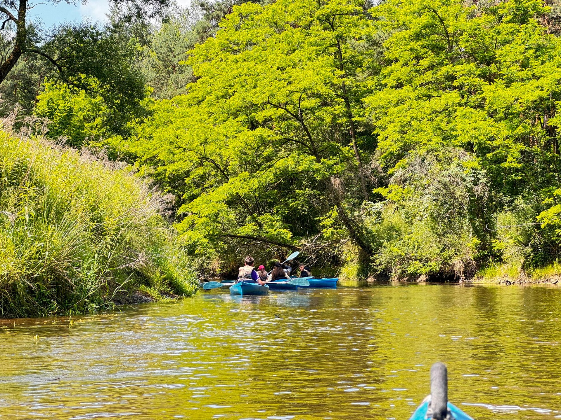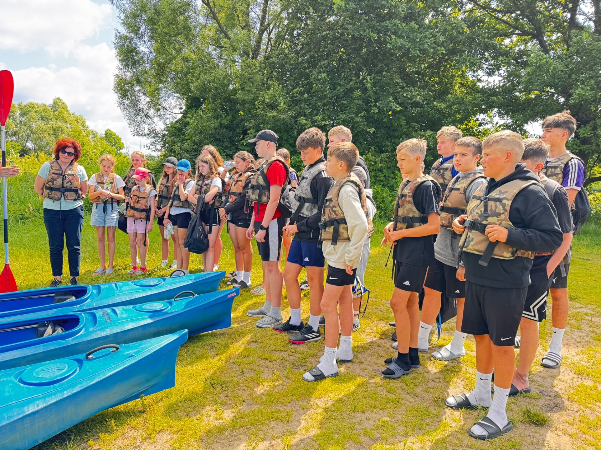 Rzeka Tanew przyjęła nas z otwartymi ramionami (i niektórych nawet przytuliła do dna). Spotkaliśmy ważki, ptaki, a podobno ktoś widział bobra – chociaż równie dobrze to mógł być… plecak kolegi. Po wodnych zmaganiach, gdy dotarliśmy wreszcie do celu, zamiast odpocząć – VI b zrobiła desant do wody! Kto mógł, wskakiwał do rzeki z piskiem i śmiechem. Były wyścigi w pluskaniu, pływanie „na leniwca” . Wszyscy ochłodzili się na maksa – niektórzy nawet tak bardzo, że długo nie mogli znaleźć ręcznika. A potem – klasyk: ognisko! Kiełbaski piekły się raz szybciej, raz wolniej (czasem z lekką nutą węgla), ale smakowały jak z najlepszej restauracji. A przy okazji – dużo śmiechu. Wróciliśmy zmęczeni, trochę mokrzy, ale mega szczęśliwi. Ten wyjazd to była klasa sama w sobie – VI b pokazała, że nie boi się wyzwań, a przygody na wodzie (i w wodzie!) to coś, co zapamiętamy na długo.😀👍☀️