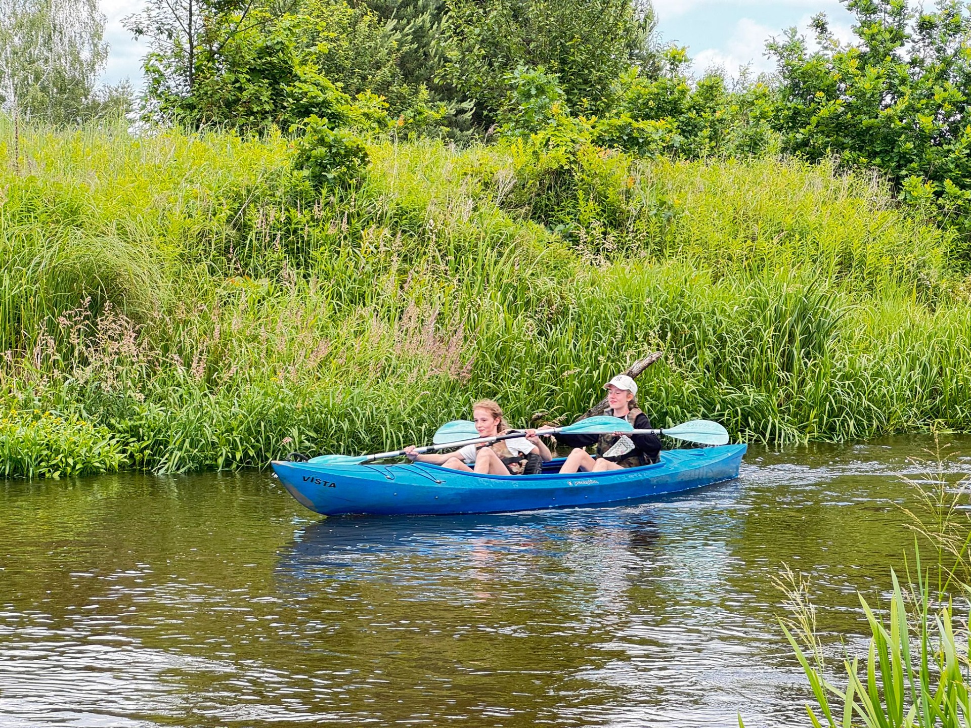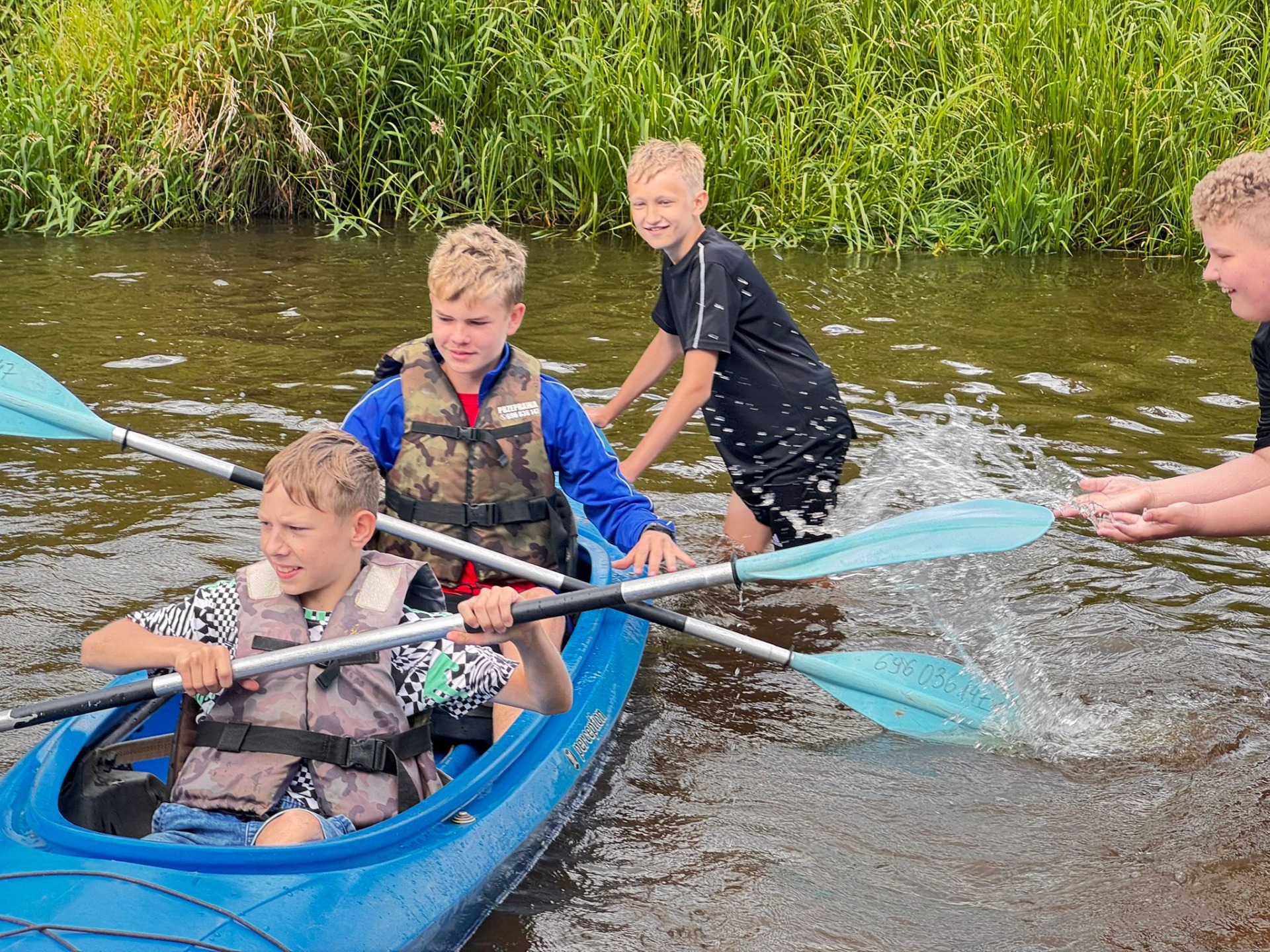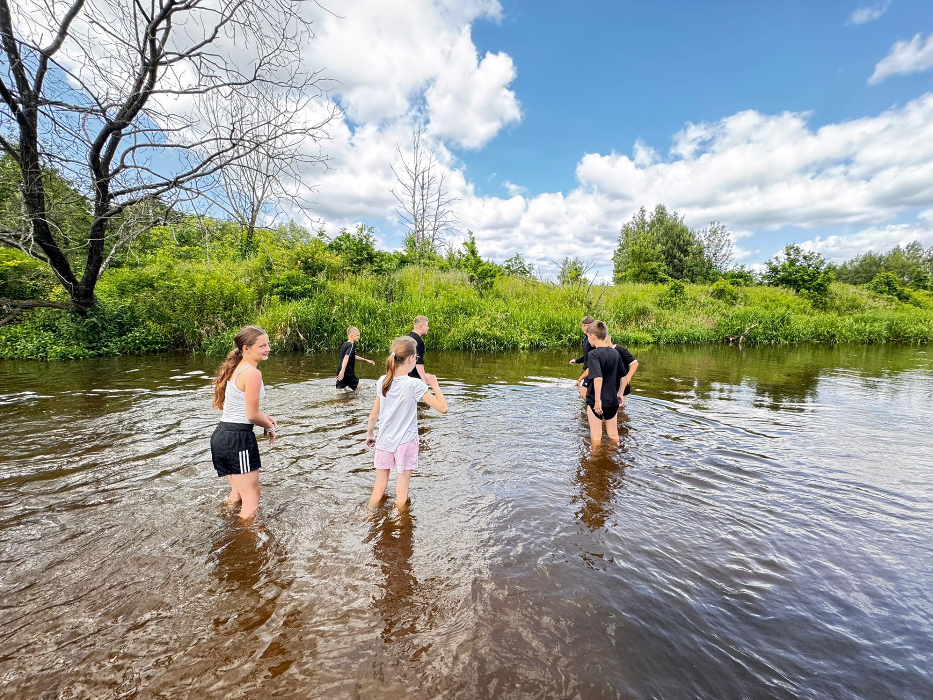 Rzeka Tanew przyjęła nas z otwartymi ramionami (i niektórych nawet przytuliła do dna). Spotkaliśmy ważki, ptaki, a podobno ktoś widział bobra – chociaż równie dobrze to mógł być… plecak kolegi. Po wodnych zmaganiach, gdy dotarliśmy wreszcie do celu, zamiast odpocząć – VI b zrobiła desant do wody! Kto mógł, wskakiwał do rzeki z piskiem i śmiechem. Były wyścigi w pluskaniu, pływanie „na leniwca” . Wszyscy ochłodzili się na maksa – niektórzy nawet tak bardzo, że długo nie mogli znaleźć ręcznika. A potem – klasyk: ognisko! Kiełbaski piekły się raz szybciej, raz wolniej (czasem z lekką nutą węgla), ale smakowały jak z najlepszej restauracji. A przy okazji – dużo śmiechu. Wróciliśmy zmęczeni, trochę mokrzy, ale mega szczęśliwi. Ten wyjazd to była klasa sama w sobie – VI b pokazała, że nie boi się wyzwań, a przygody na wodzie (i w wodzie!) to coś, co zapamiętamy na długo.😀👍☀️