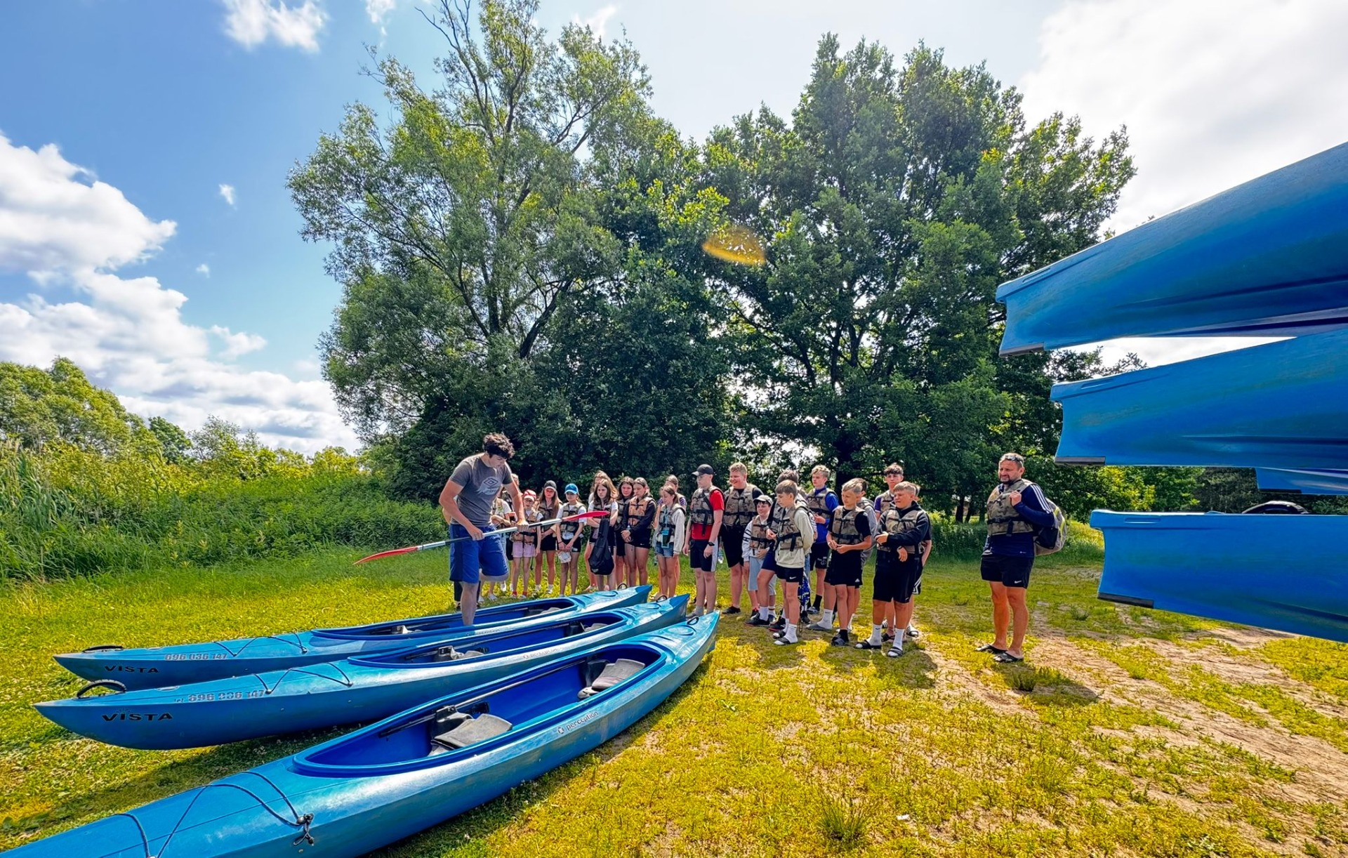 Dnia 17 czerwca klasa VI b ruszyła na specjalną misję – celem były Pisklaki, a bronią… wiosła i dobry humor! Już w autobusie czuć było emocje – niektórzy martwili się, że wpadną do wody, inni że nie będą wiedzieć, gdzie przód kajaka. Ale wszyscy byli gotowi na przygodę! Po dotarciu na miejsce i wysłuchaniu krótkiego (ale ważnego!) szkolenia, uczniowie wskoczyli do kajaków. No… może nie dosłownie, bo większość próbowała najpierw znaleźć równowagę, co nie zawsze się udało. Jedna para wypłynęła... tyłem, inna zgubiła kierunek, a ktoś wołał: „Nie wiem jak hamować!”. Ale przecież o to chodzi – było śmiesznie, mokro i niezapomnianie!