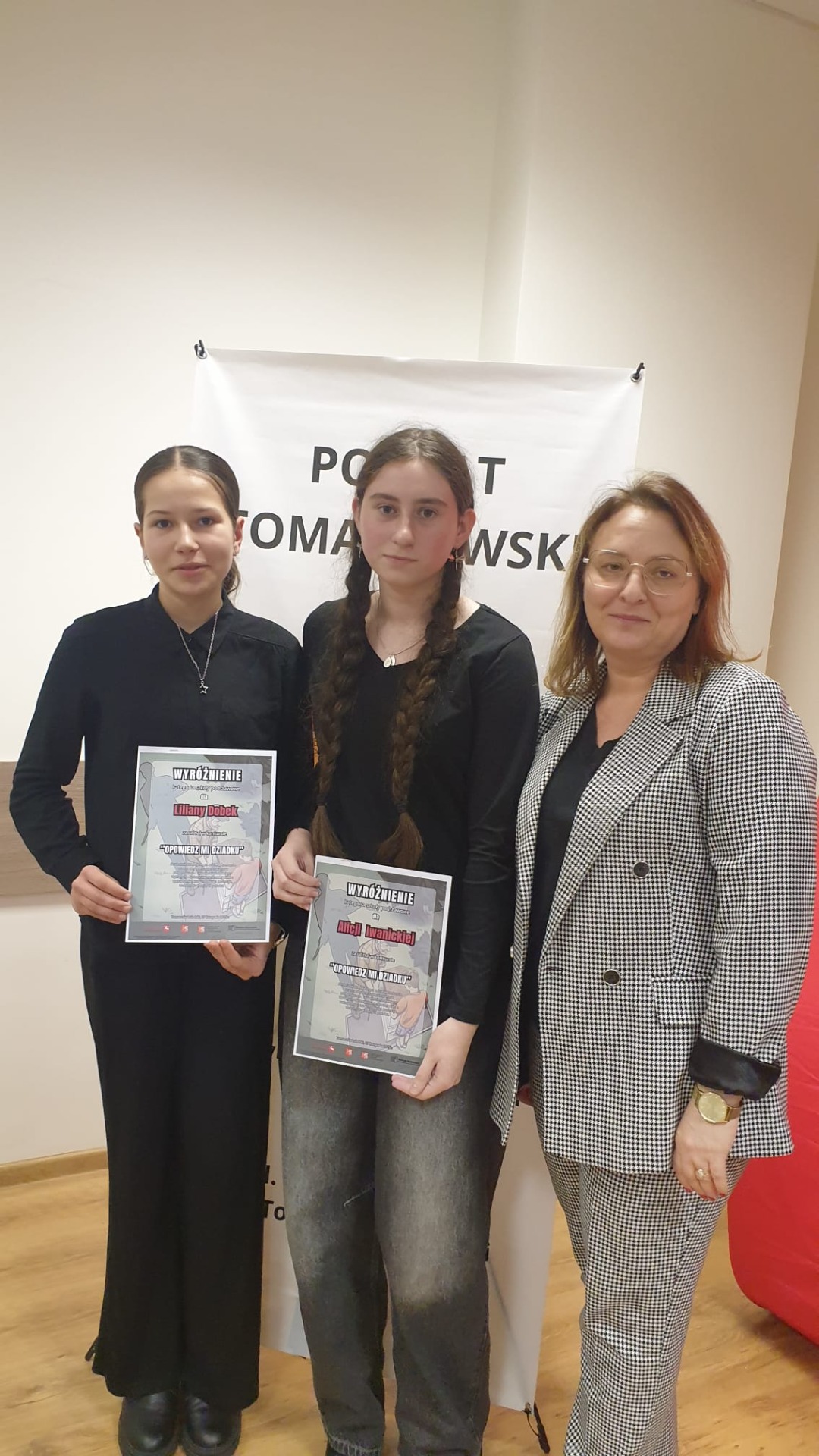 Ogromne gratulacje należą się Alicji Iwanickiej i Lilianie Dobek z klasy VIIa za otrzymane wyróżnienia w konkursie historycznym "Opowiedz mi dziadku" zorganizowanym przez Stowarzyszenie Samorządów Powiatu Tomaszowskiego i Muzeum Regionalne im. dra Janusza Petera w Tomaszowie Lubelskim. Dziewczyny pracowały pod opieką swojej nauczycielki języka polskiego pani Renaty Śrutwy-Krupy. Ala przygotowała pracę na temat człowieka, który miał odwagę dać schronienie Żołnierzom Niezłomnym - pana Edmunda Szczepańskiego z Brzezin. Liliana natomiast zebrała na podstawie rodzinnych przekazów wspomnienia swojego pradziadka Józefa Pitury pseudonim "Piła" należącego do Światowego Związku Żołnierzy Armii Krajowej. Podsumowanie konkursu odbyło się 27 listopada 2025 r,. w Starostwie Powiatowym w Tomaszowie Lubelskim. Dziewczyny włożyły ogrom wysiłku w swoje prace. Gratulujemy👏.