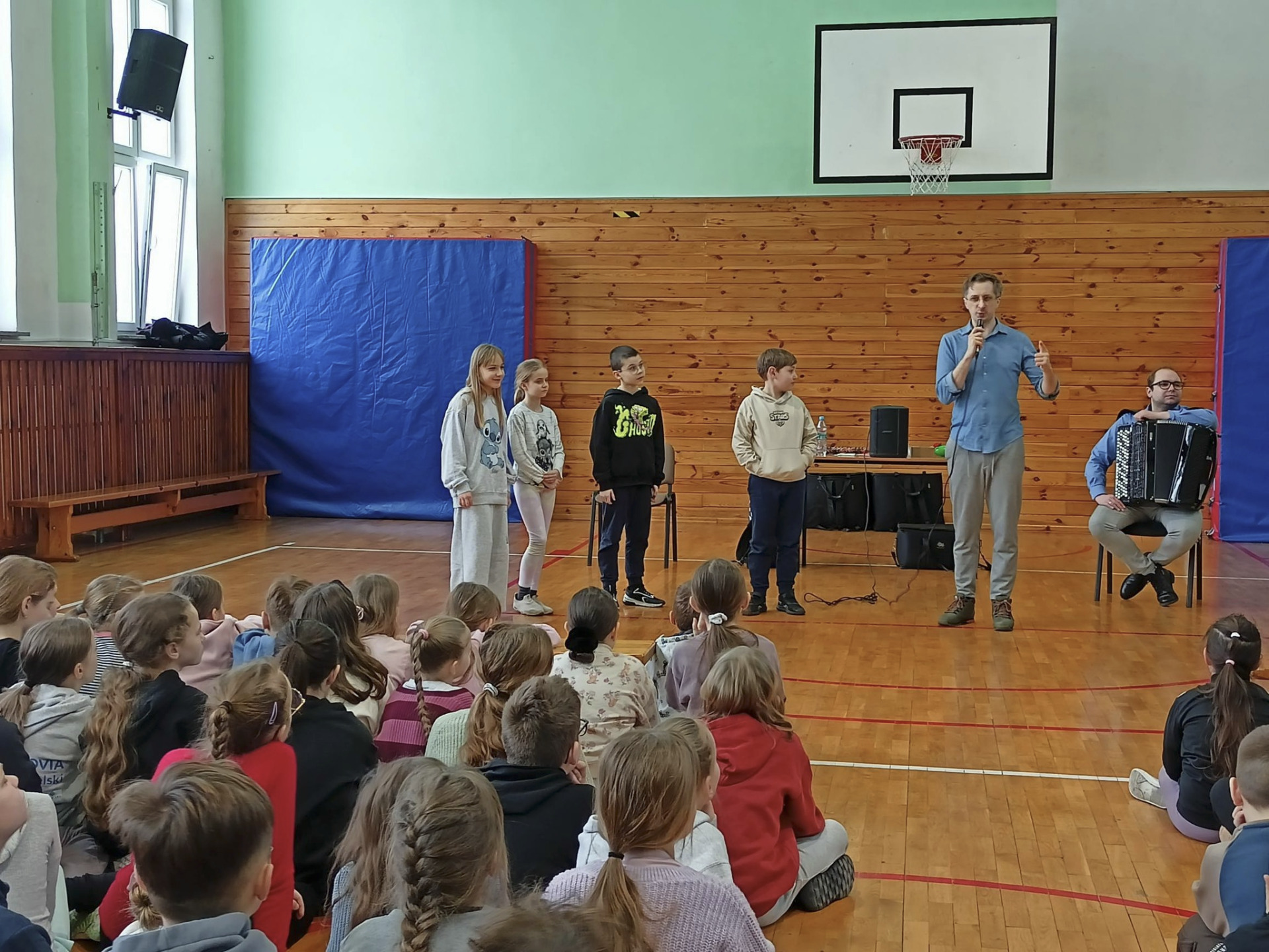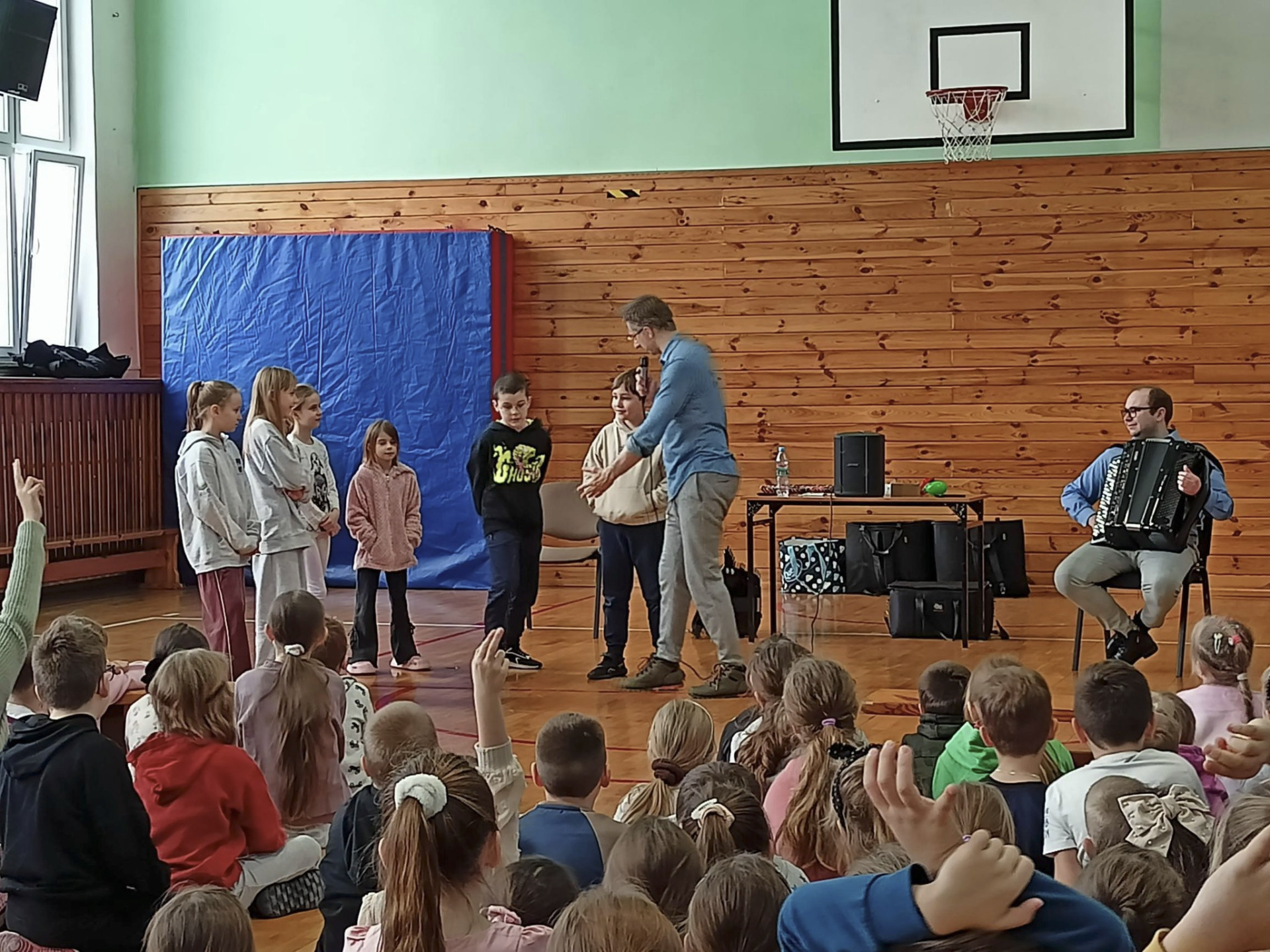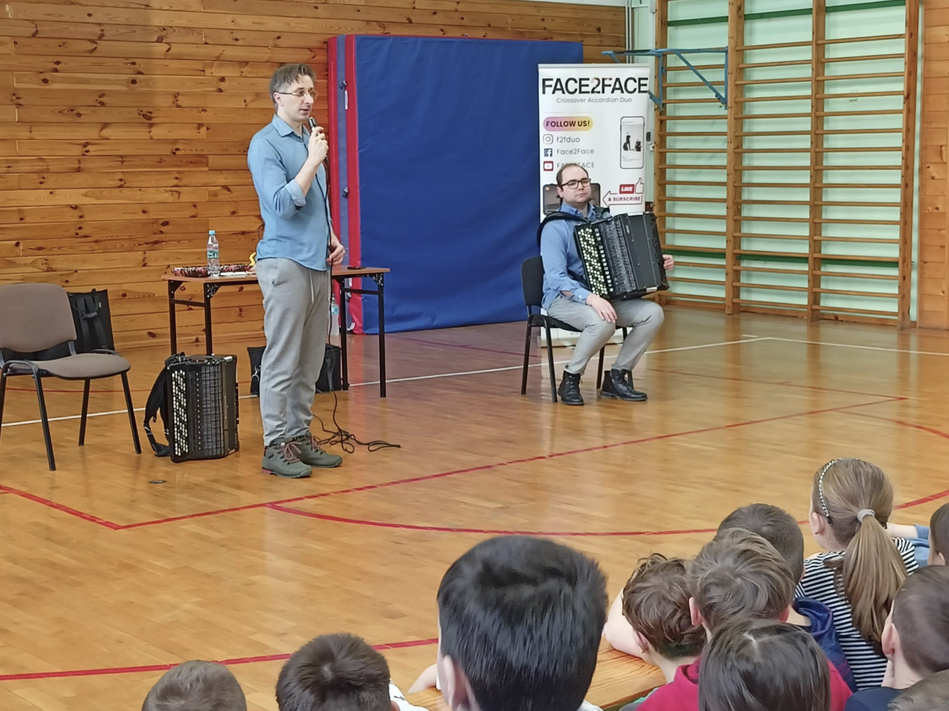 16 stycznia gościliśmy w szkole duet muzyków zespołu "Face 2 Face". Panowie wykazali się wszechstronnością i kreatywnością, zaprezentowali kilka instrumentów muzycznych. Prym wiodły utwory grane na akordeonach.😀 Muzycy porwali dzieci do wspólnej zabawy. 🤠👍